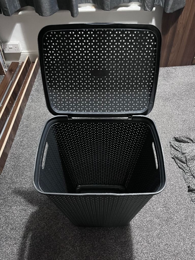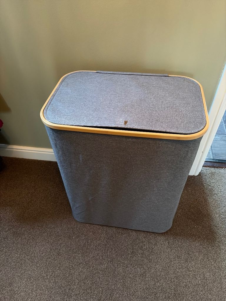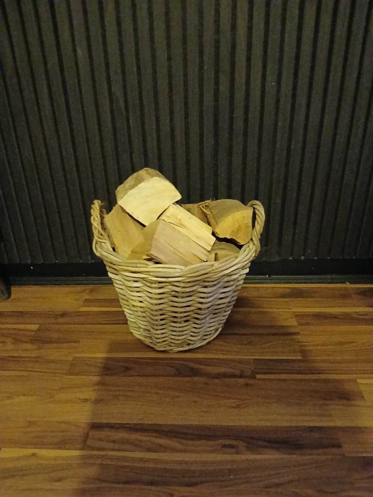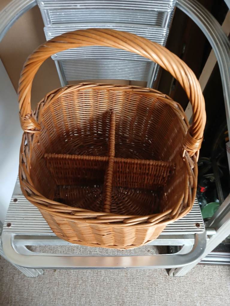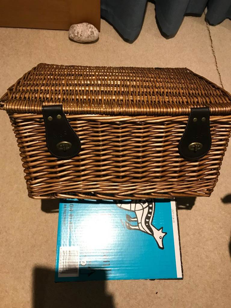 Well made wicker basket, lined with grey and white deer pattern cotton. In clean perfect condition. Large oval shape, with handle, measures 44cm long and 34cm across. Complete with brown paper label, ready to pack with goodies for a perfect Christmas present!
