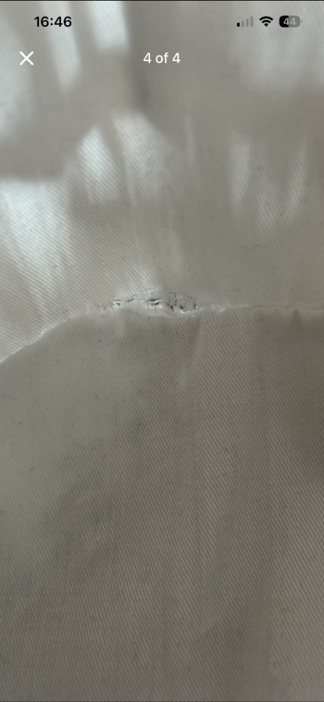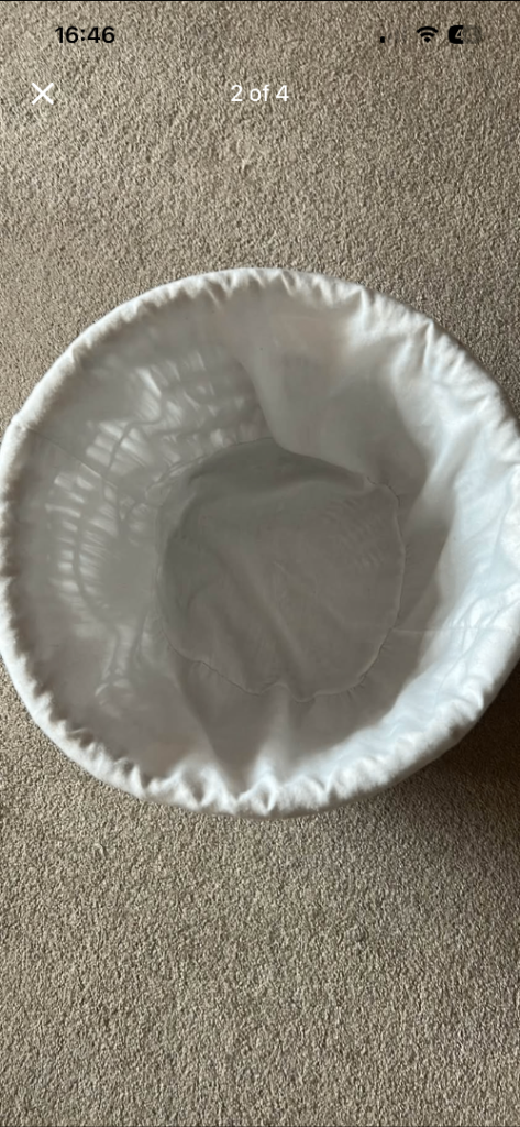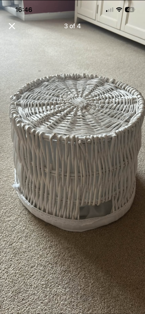 White wicker basket with material lining small tear in lining as per picture, perfect for blankets, wedding accessories etc, 40cm across, 30cm high, collection only
