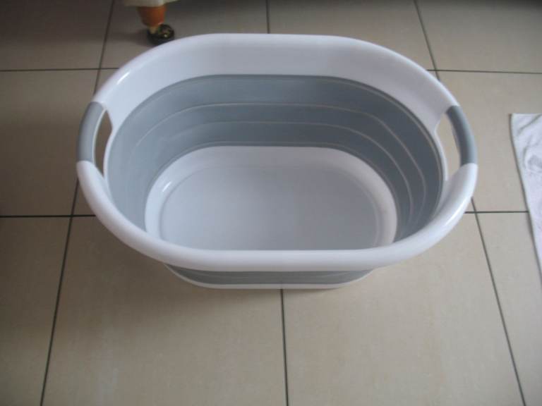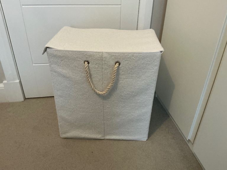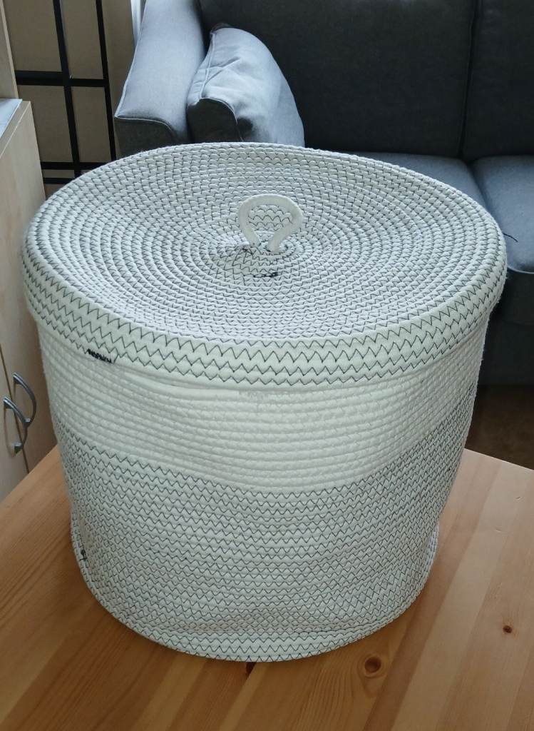 Large cream wicker laundry basket with lid.