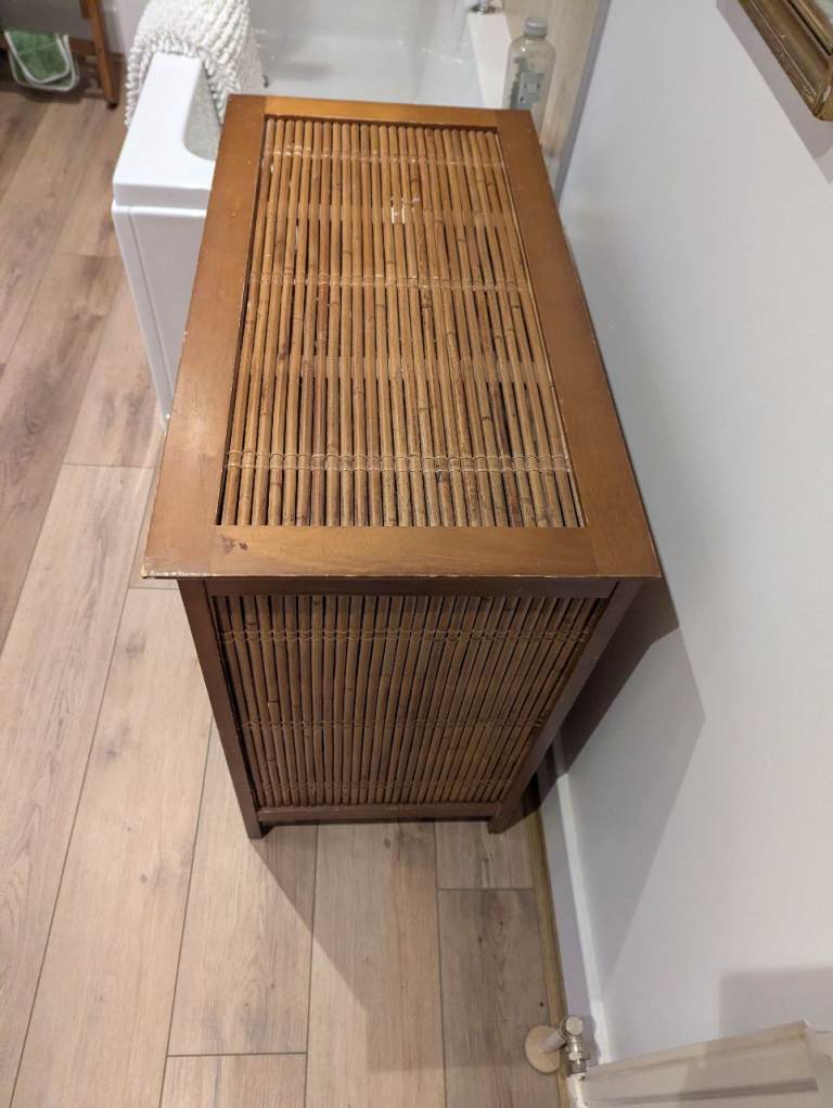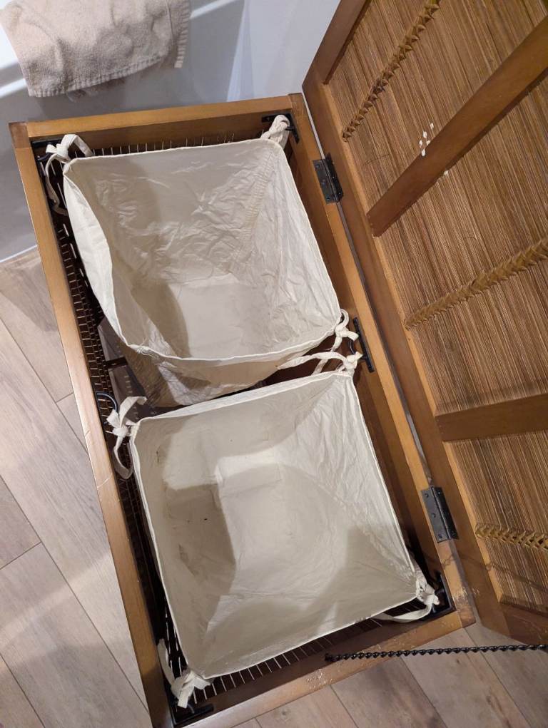 Wooden and wicker laundry basket with two separate linen compartments. One corner tie to one compartment is broken but other than that works fine.