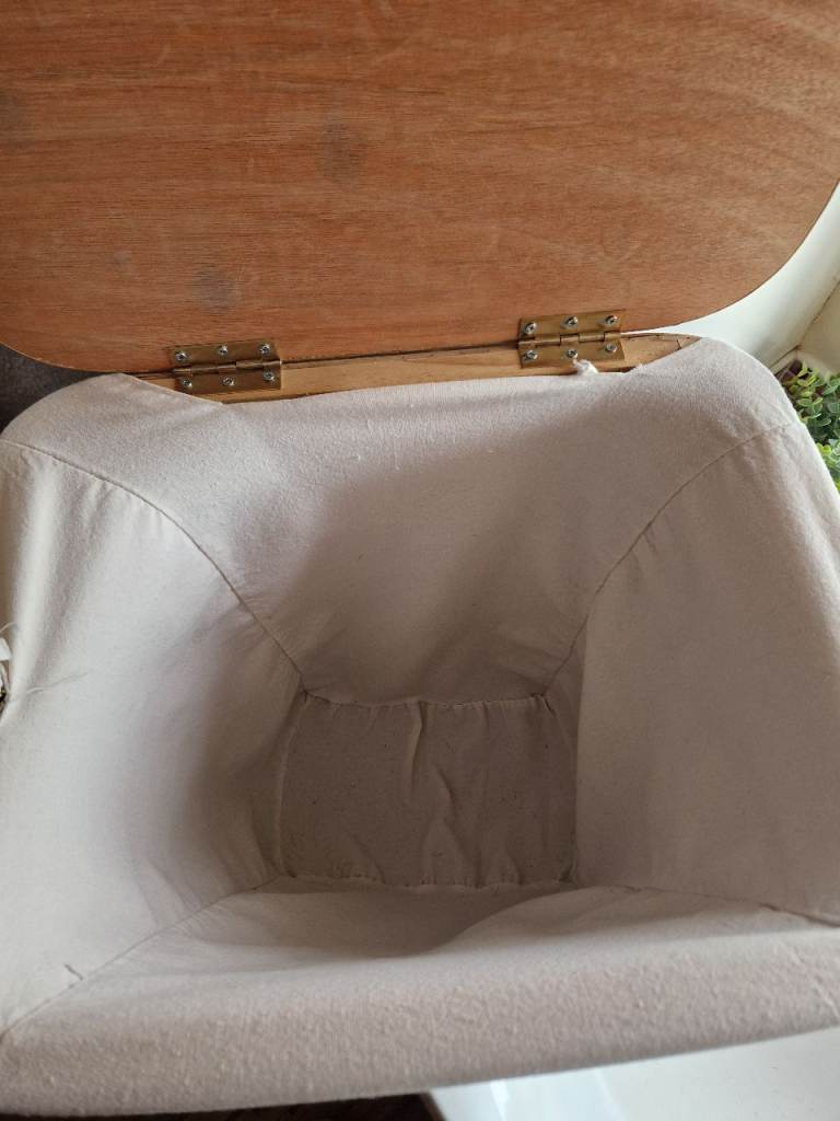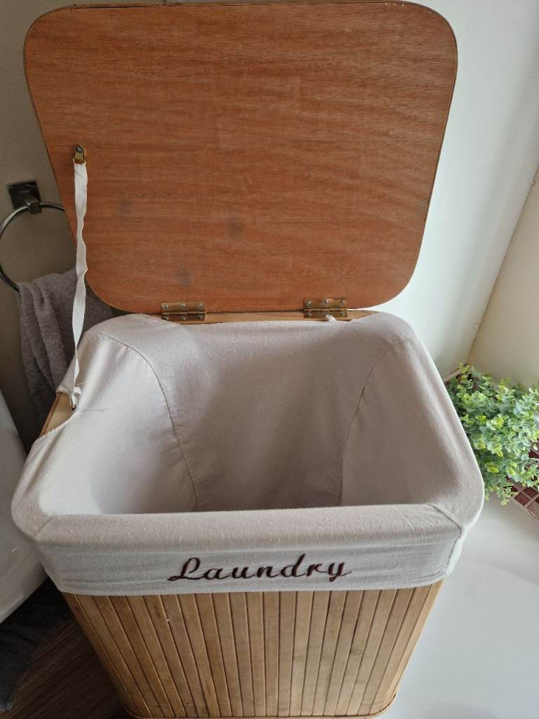 Wooden bamboo laundry bin basket hamper fully lined. No longer needed