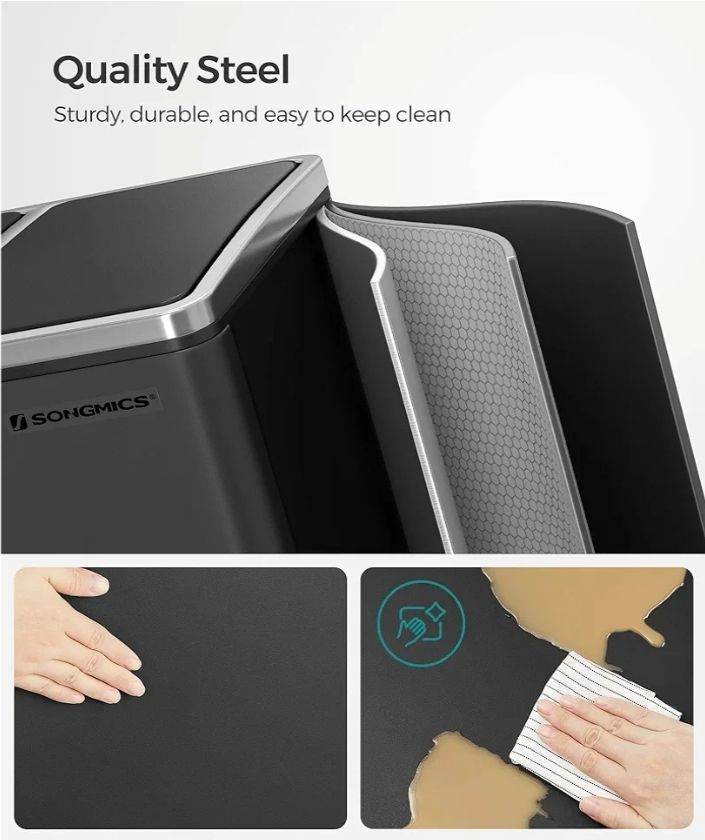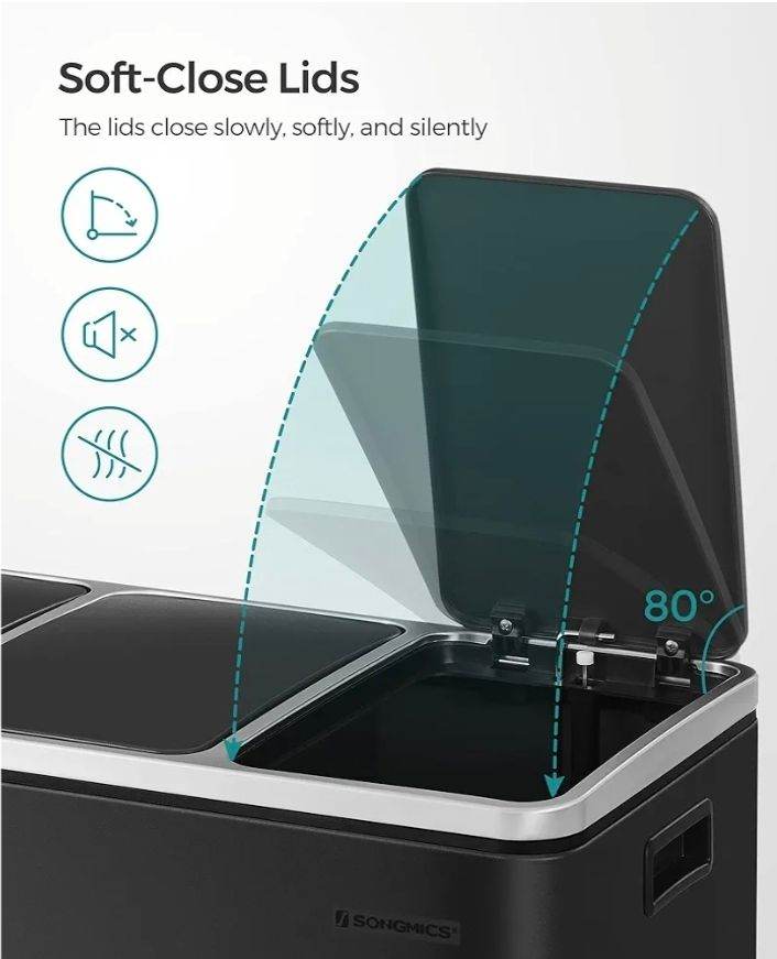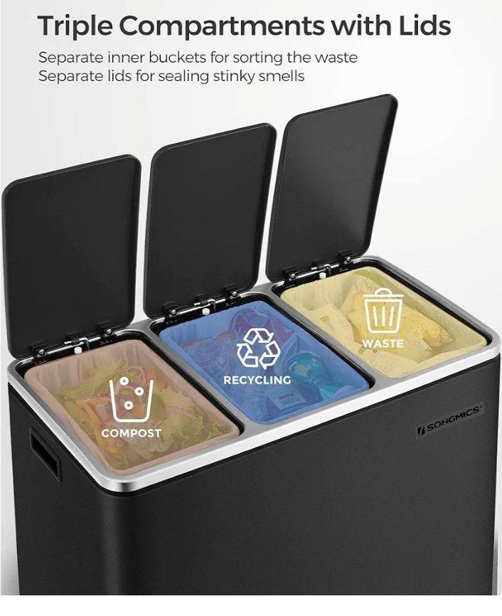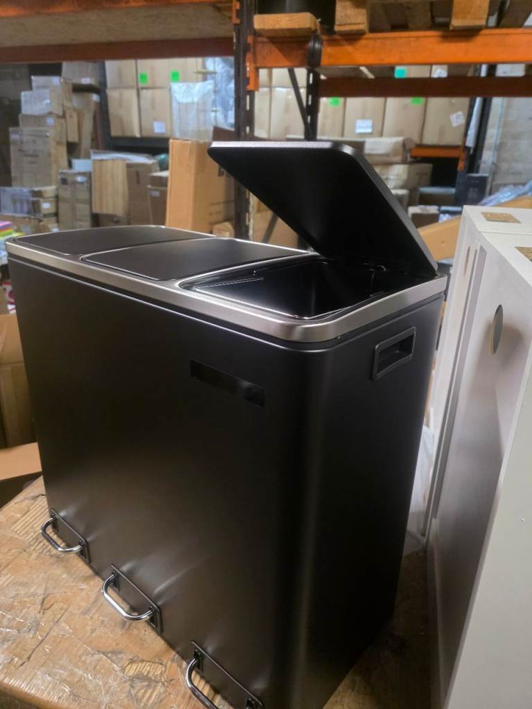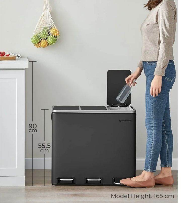 A new still boxed black and silver triple Kitchen Bin, 3 x 18 L Recycling Bin, 3 Compartment Rubbish Bin for Recycling and Waste, 15 Liners Included, Soft-Close Lids, Pedals, Inner Buckets, Steel, Ink Black the measurements are enclosed in the pictures the r.r.p is 89.99 we are selling it for 45.00 collection only it is st aidens Church summer Bank Road Tunstall st6 5ey we are there mon to sat 9am to 3pm with thanks .