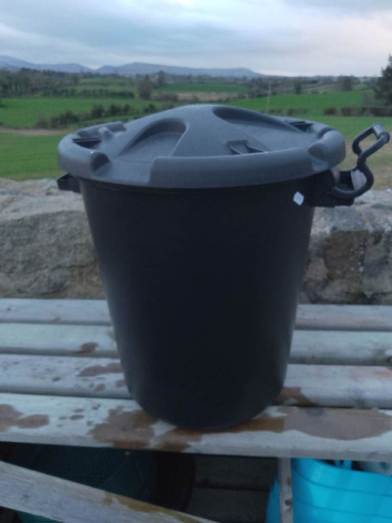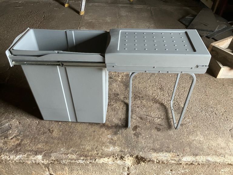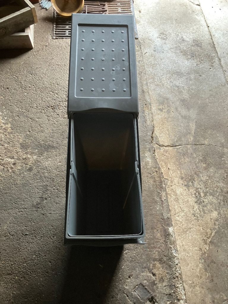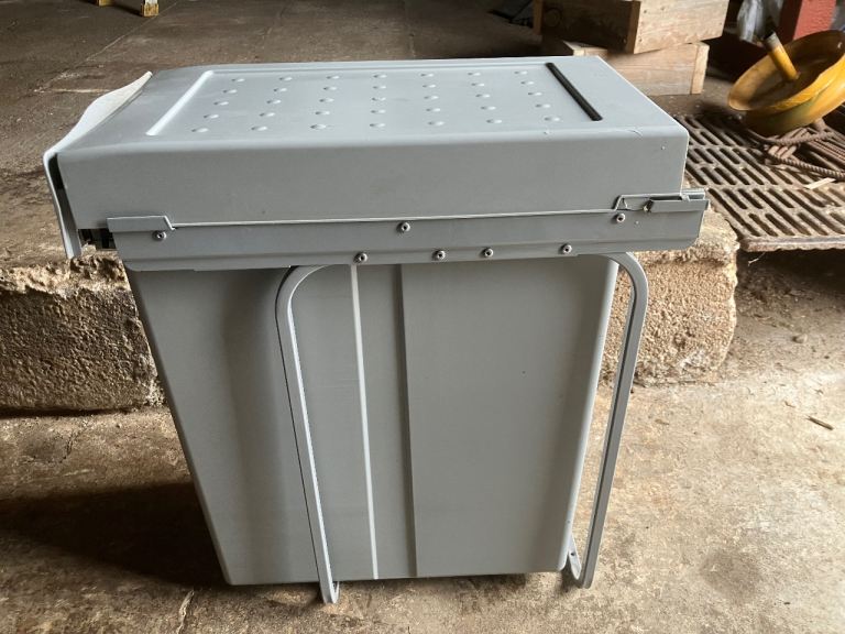 Kitchen bin, fits inside cupboard by screwing down behind cupboard door & pulls out to fill or remove bin for emptying. Height 55cms width 26cms depth 46cms. Buyer collects