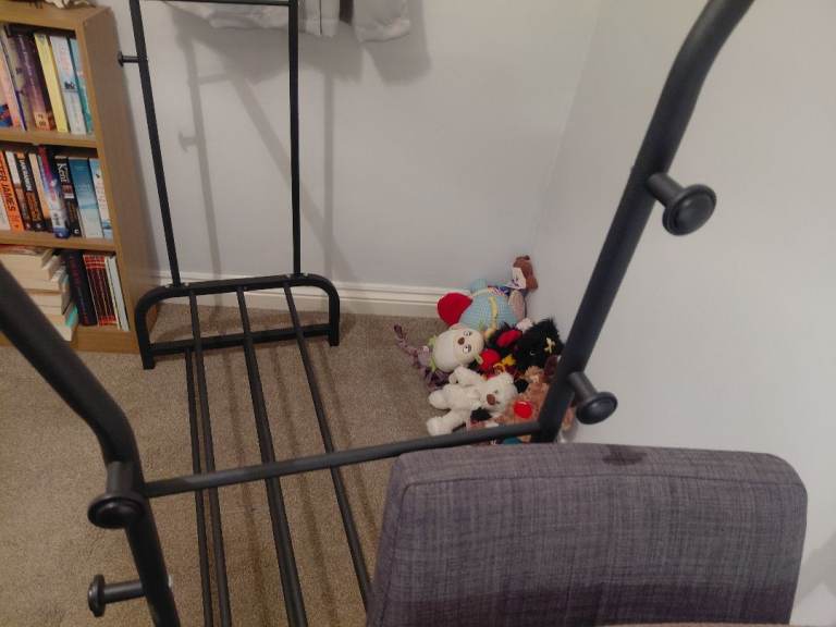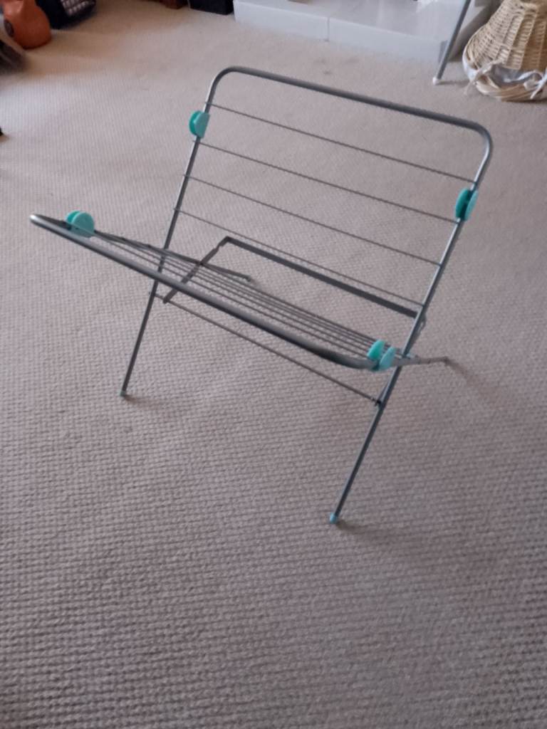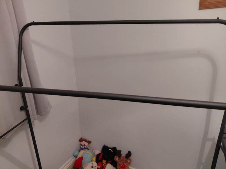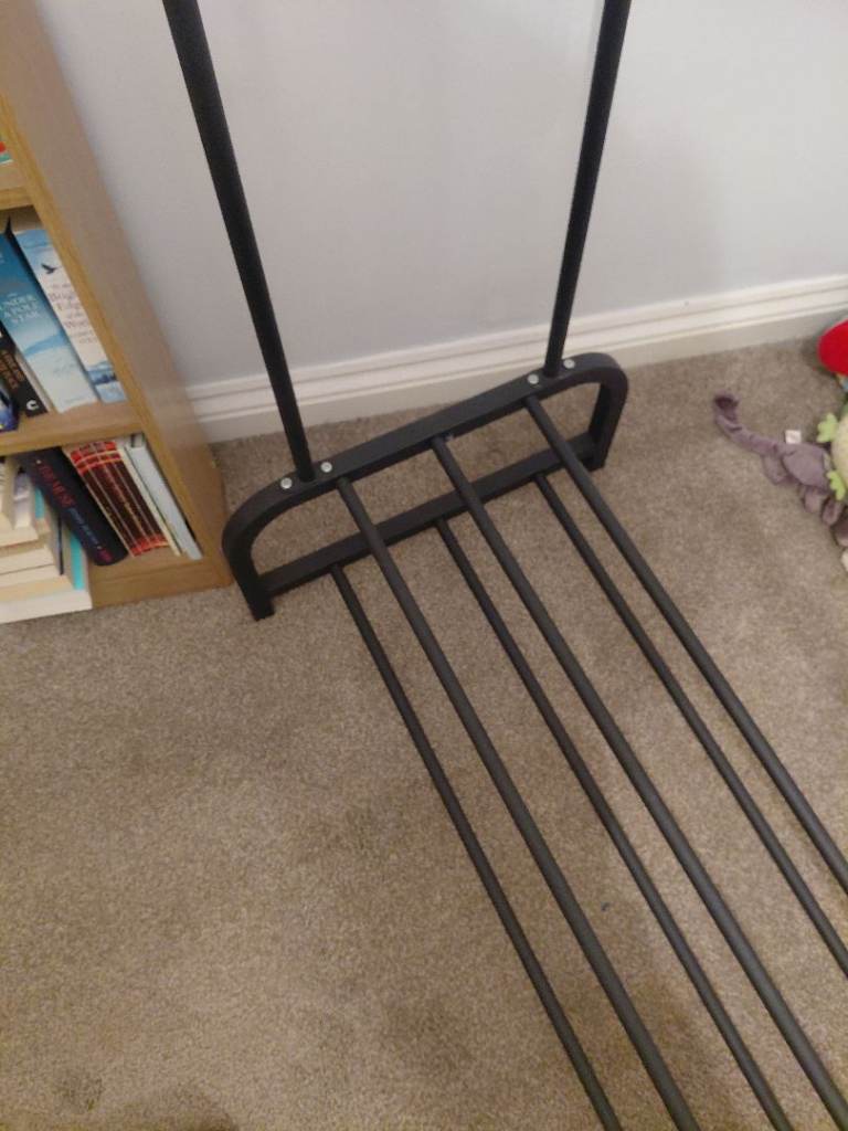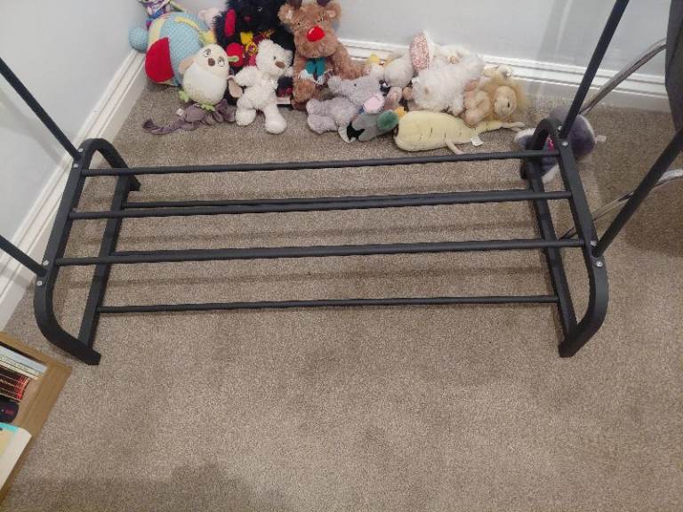 Clothes rack approx 43in wide 58 in high has a places to store shoes. One at the back is higher than the other for longer items. I bought this to store my clothes on when I was painting instead of putting on the floor. It is a very solid black coating and wider at the bottom.