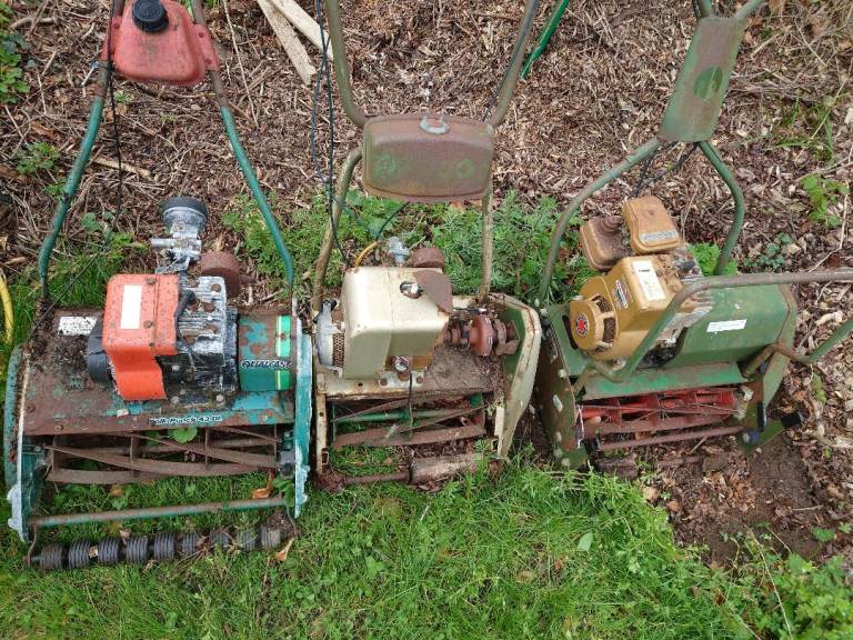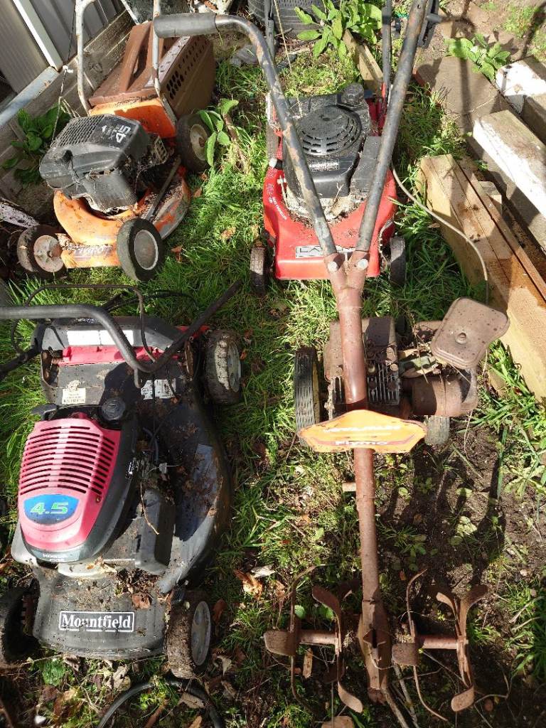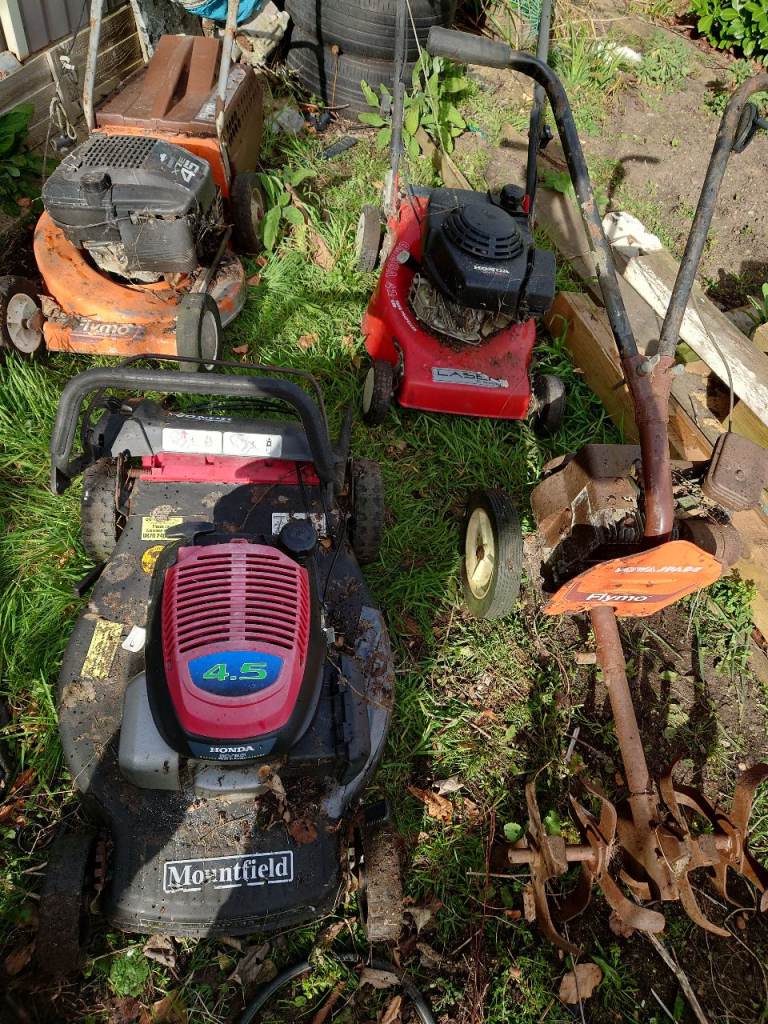 7 Lawn mowers spares or repairs. Plus rotavator, scarifier, 3x Honda engines, 3x cylinder mowers boxes bag blades carbs