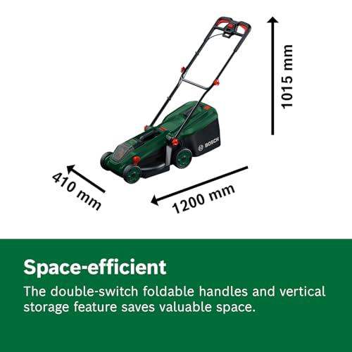 • Seamless mowing, compact storage: Double-switch foldable handles and vertical storage allows easy maneuvering and space-saving
