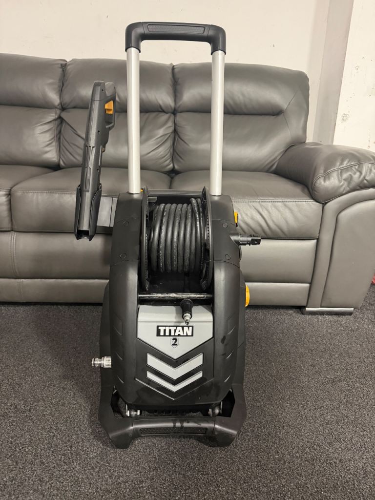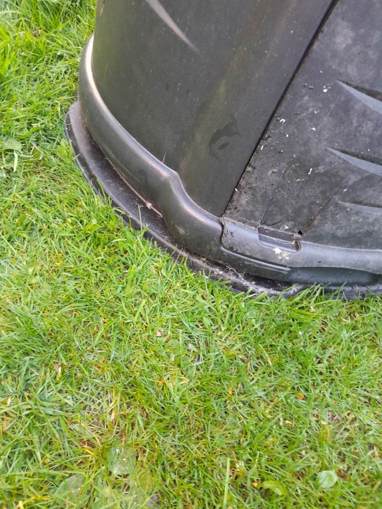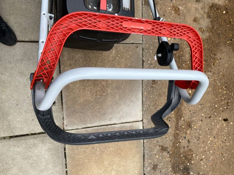 Comes with a grass collection bag, showing typical signs of use but no major damage.