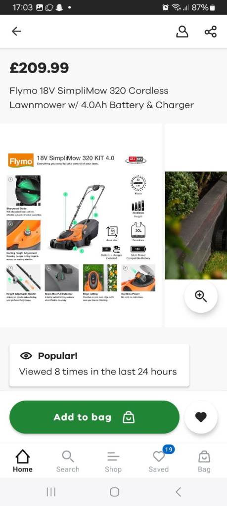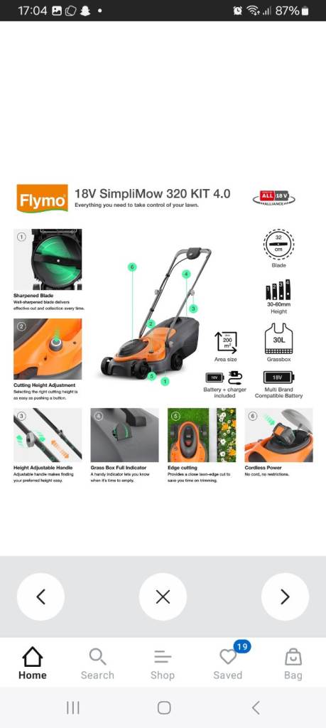 Only put together and tried to test it all works cant be doing the garden its to much so gona get a gardener so selling this it has height setting for different size grass cut battery and charger box is here as only put it together today n tested it i bought it for 210 will sell for 170