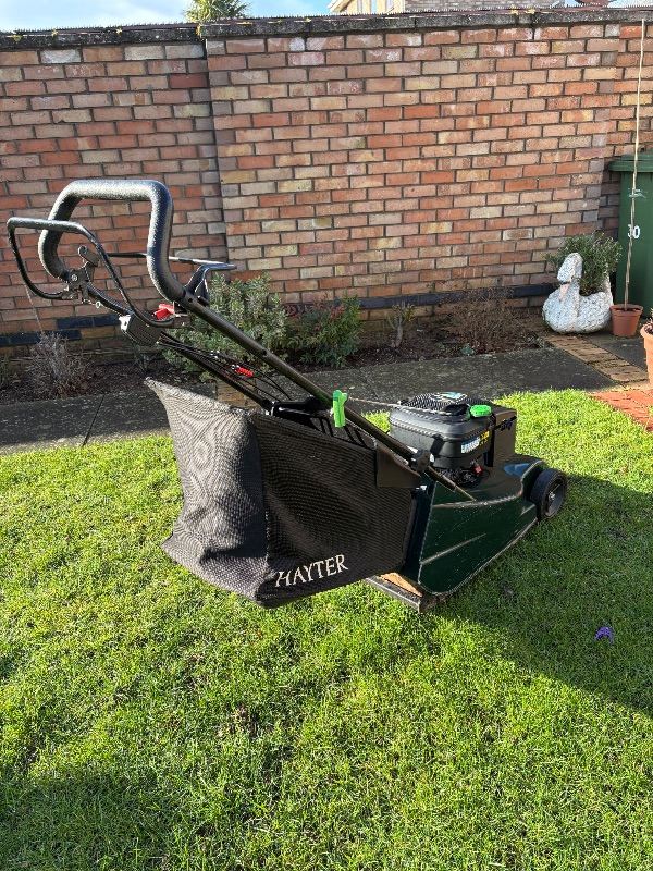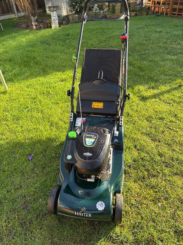 Hayter harrier 48 petrol self-propelled lawnmower, as you can see from the pictures good condition, just been serviced, new oil , new spark plug, new air filter and blade sharpened and balanced, so ready to go, all runs as it should, heavy duty professional lawnmower, 19” cut , few marks on the sides which is normal for used lawnmowers but solid and runs beautifully, ideal for large gardens, big grass bag, heavy roller at the back to create those lovely looking stripes to give your lawn that professional look, new these are expensive, due to the size and weight of the lawnmower this is collection only, handles fold down for easier transportation. Selling for £400.00. Ono.