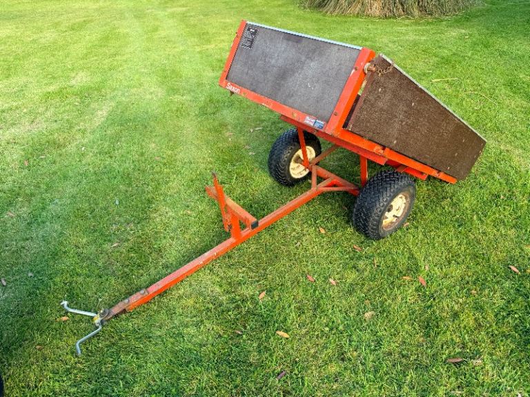 48” cutting deck, approx 15 years old, including Saxon tipping trailer, mulching bung.