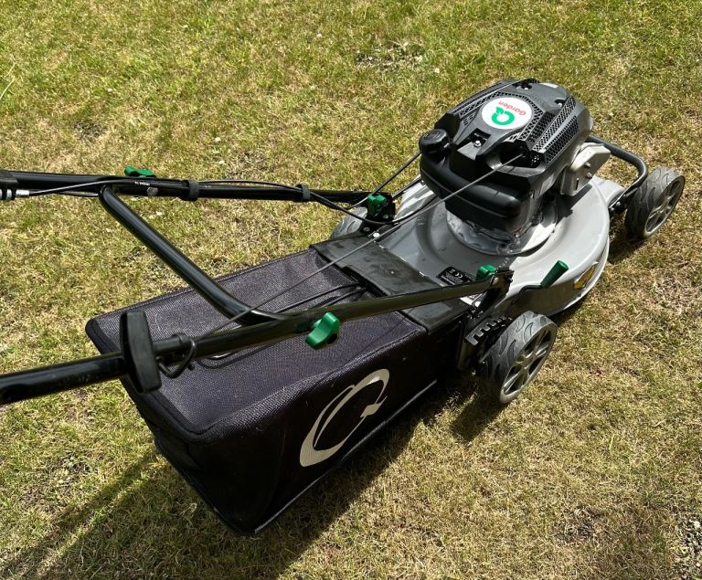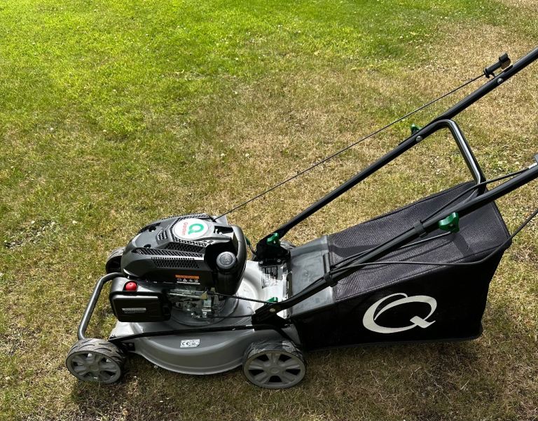 Like New Q Garden petrol lawnmower. Serviced & sharpened. Mower is fitted with a Mountfield OHV engine. The deck is of a solid steel construction. Mower comes with a grass collection bag and the handlebars fold for storage or transportation.