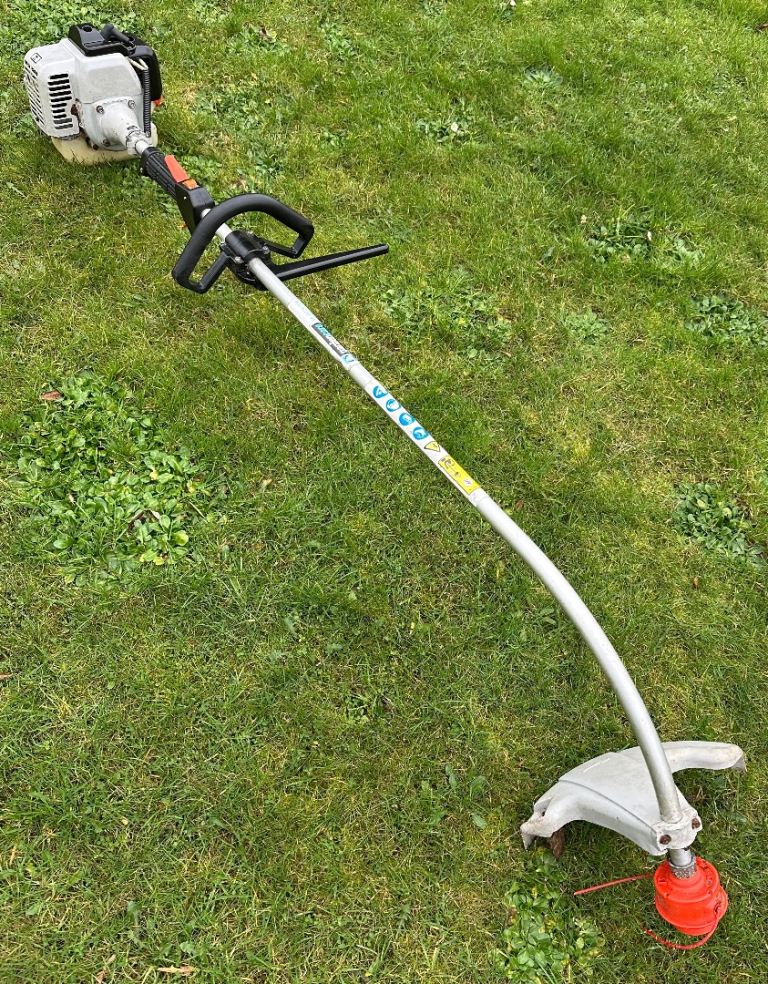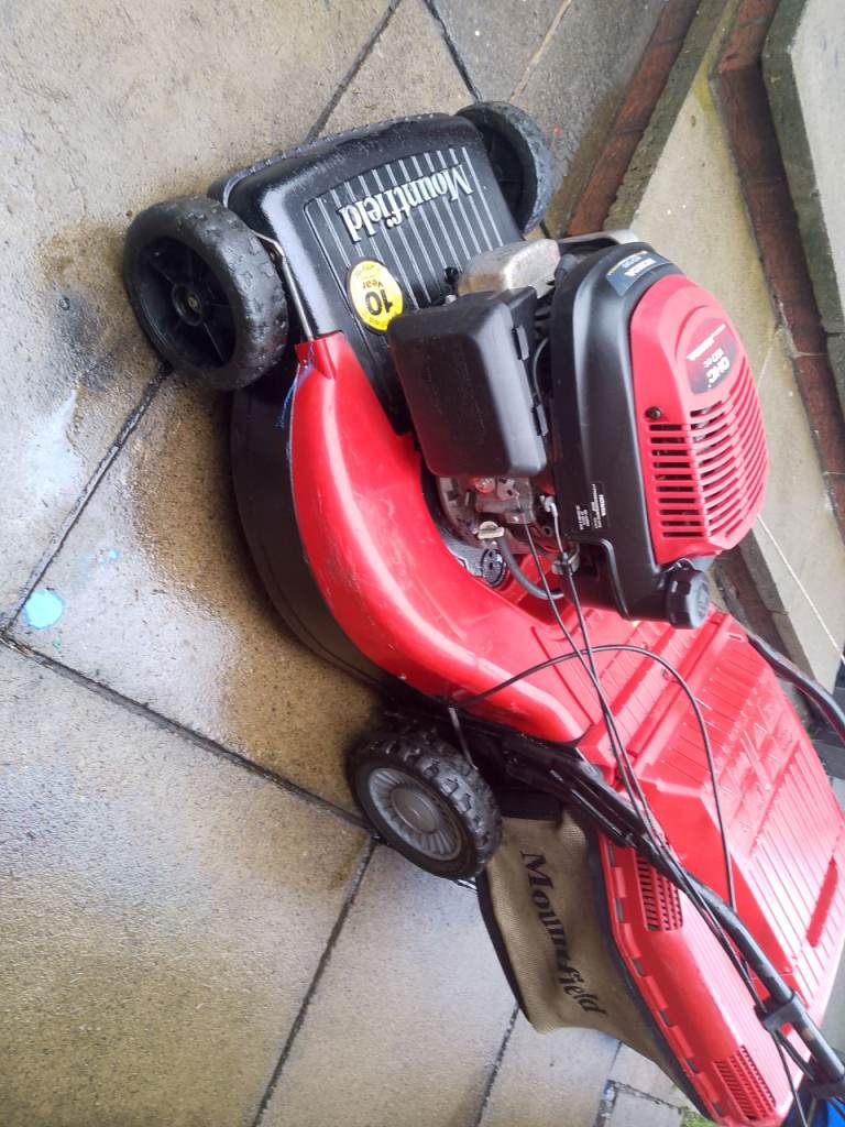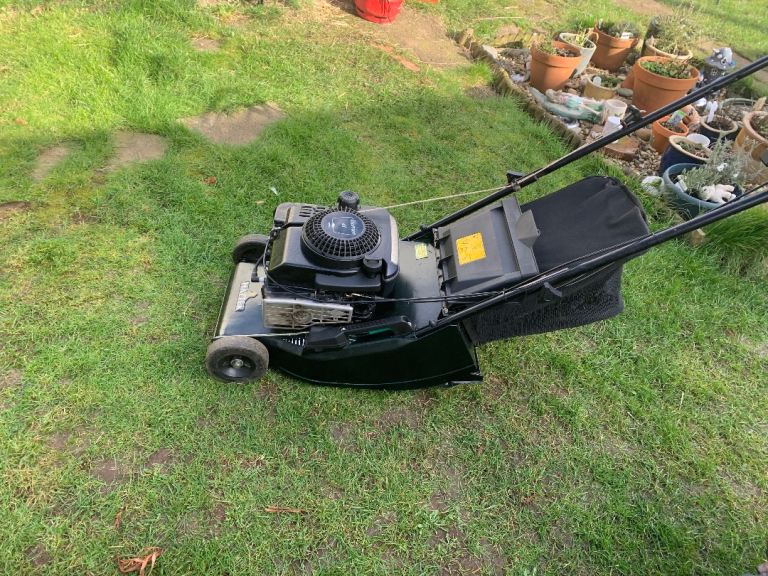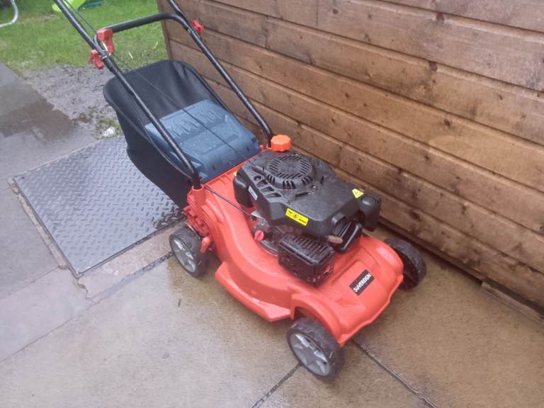Flymo Turbo Compact 330 electric lawnmower in good working order, includes original orange cable and grass collection box, with some signs of use, ideal for small and medium gardens.