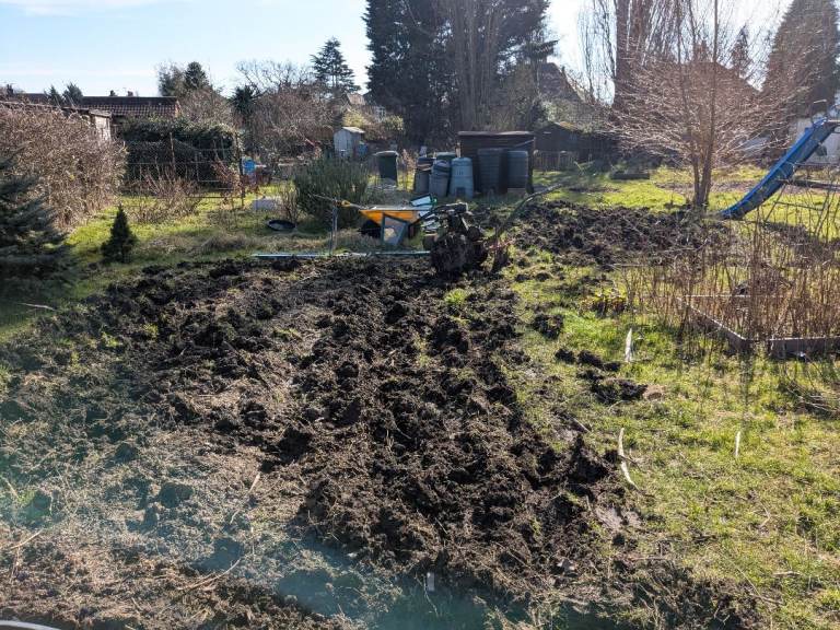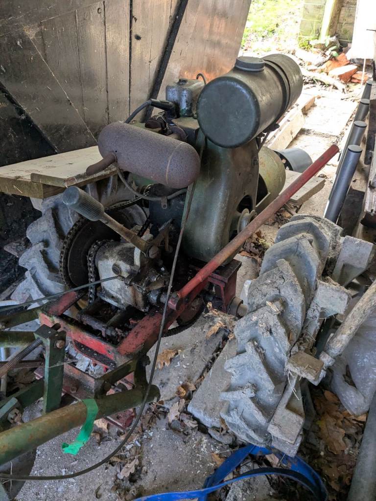 Last used spring 2025 to plough on allotment. Most things are pictured including finger bar mower, metal wheel tines, plough and harrow attachment (not pictured).