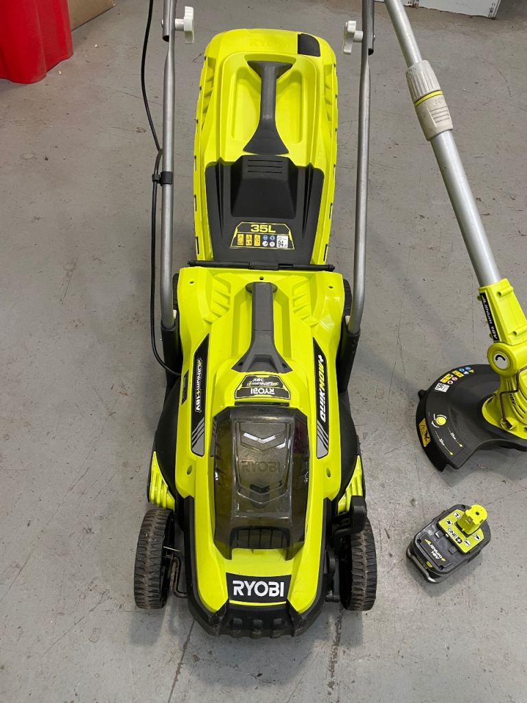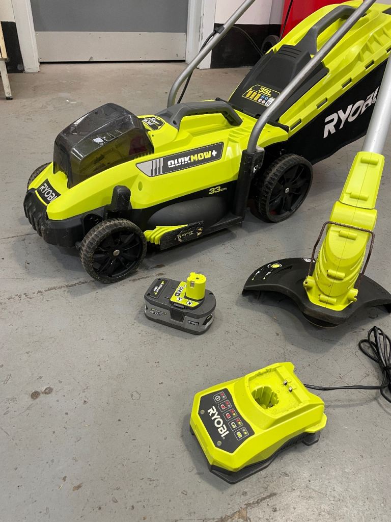 Ryobi 18V ONE+ cordless lawnmower and strimmer/trimmer. Comes with genuine Ryobi 4.0 ah battery and charger. In good condition and ready to use.