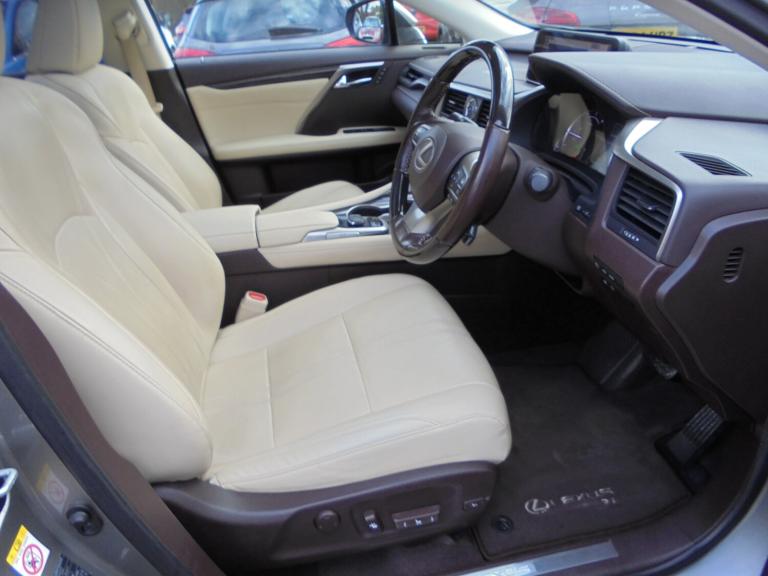 A FANTASTIC LOOKING AND DRIVING LEXUS RX450H PREMIER IN SONIC TITANIUM WITH RICH CREAM/NOBLE BROWN INTERIOR. THIS LEXUS IN IN VERY GOOD CONDITION AND COMES WITH 12 MAIN DEALER SERVICE STAMPS AND HAS BEEN VERY WELL MAINTAINED PLUS IT HAS 3 KEYS AND IS RUNNING ON BRIDGESTONE DUELLER TYRES AS SUPPLIED FROM NEW. THE PREMIER MODEL COMES WITH EVERY EXTRA INCLUDING MARK LEVINSON SURROUND SOUND , OPENING PANORAMIC ROOF, CLIMATE CONTROL, SAT NAV/BLUETOOTH/USB, 20 INCH ALLOY WHEELS, PRIVACY GLASS, ALL ROUND CAMERAS WITH PARK ASSIST, HEATED AND VENTILATED PERFORATED LEATHER SEATS, FULL LED HEADLAMPS WITH ADAPTIVE HIGH BEAM, ADAPTIVE CRUISE CONTROL, DOOR SILL ILLUMINATION, FACTORY CARPET MATS, MULTI AIRBAGS AND MUCH MORE. THIS LEXUS IS MY OWN CAR SO THE MILES WILL GO UP. THE LEXUS IS SO REFINED AND QUIET WHICH MAKES IT A PLEASURE TO DRIVE. ANY TRIAL OR INSPECTION IS WELCOME. PLEASE CONTACT US FOR MORE INFORMATION IF REQUIRED.