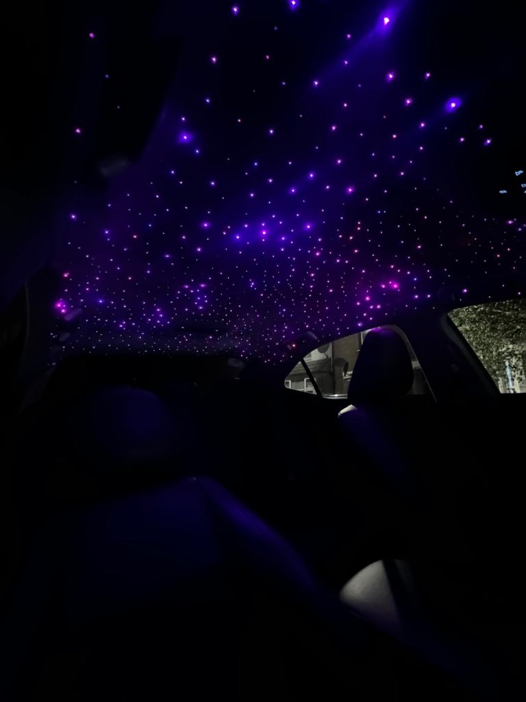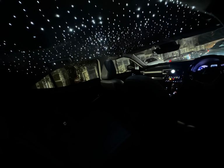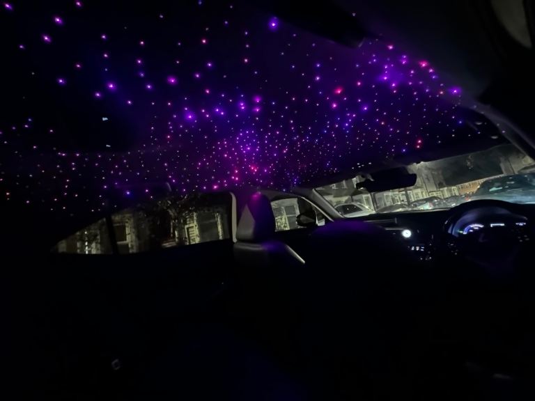 A unique feature of this car is the custom-installed starlight headliner, which offers 64 different colours and can be controlled via an app or remote adding a premium, ambient feel to the interior. Which is shown in the pictures.