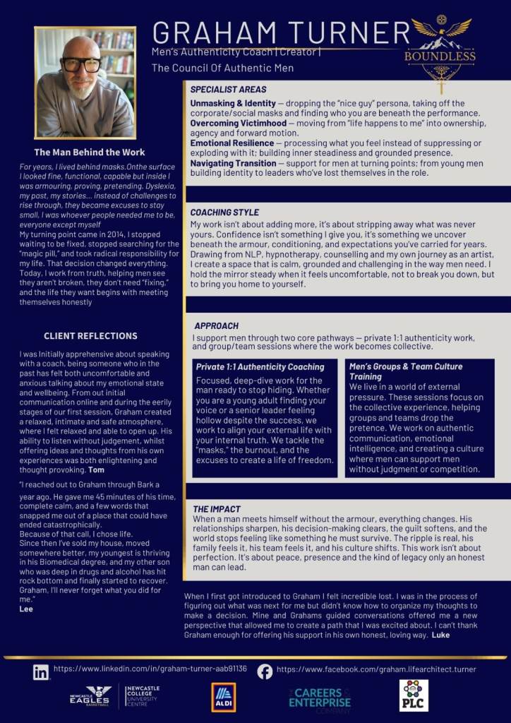 Other areas successfully dealt with for clients, include saving relationships and marriages, positive masculinity, Imposter Syndrome, narcissism, codependency, validation, people pleasing, procrastination, avoidance, and self-sabotage.