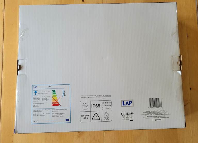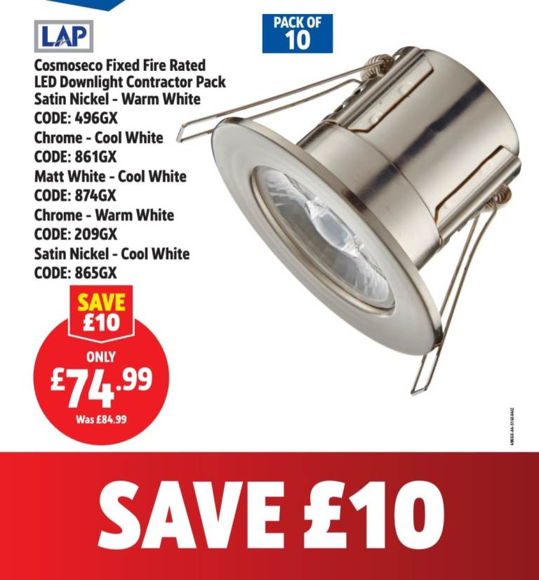 Pack of 10 LAP, cool white, white bezel downlights. They are IP65 rated suitable for kitchens and bathrooms, cutout size is 57mm.
