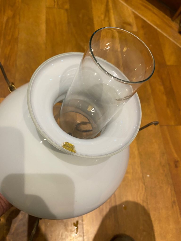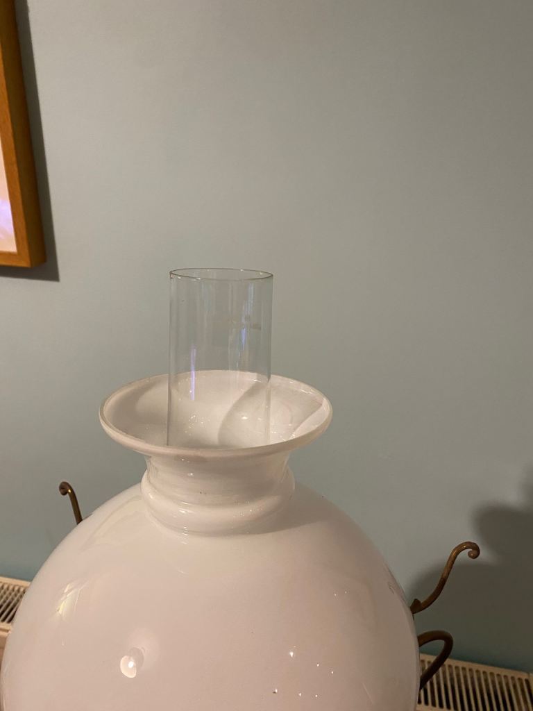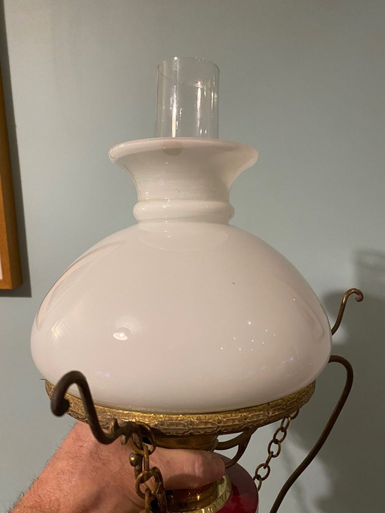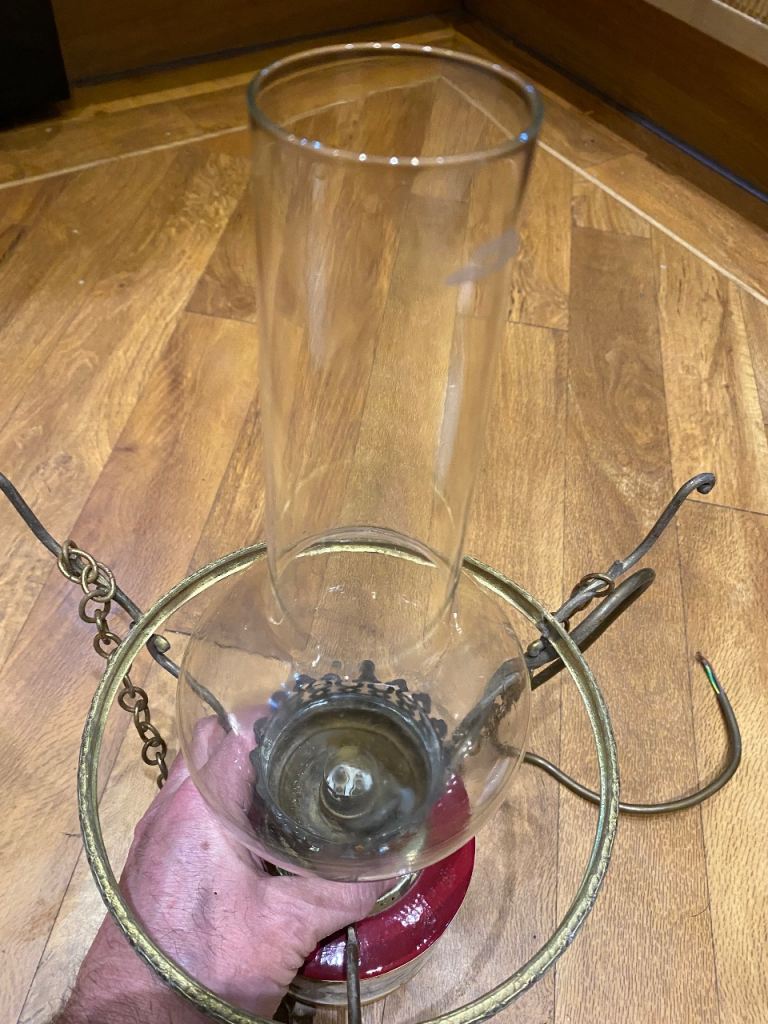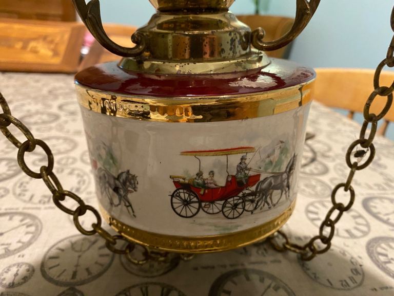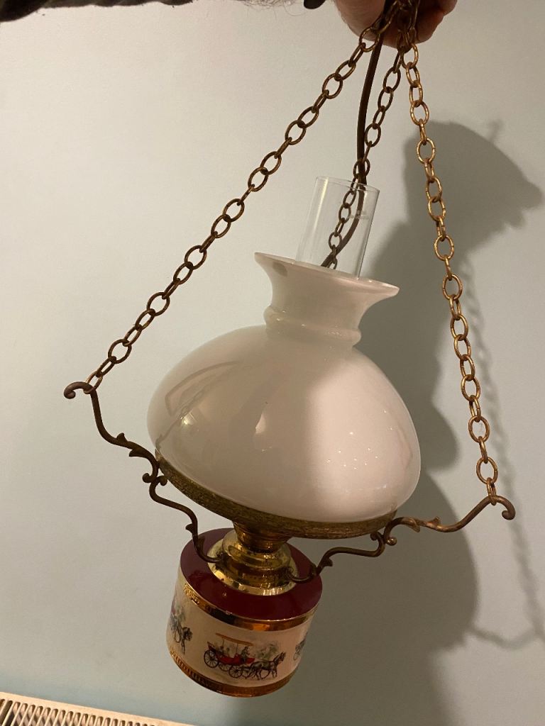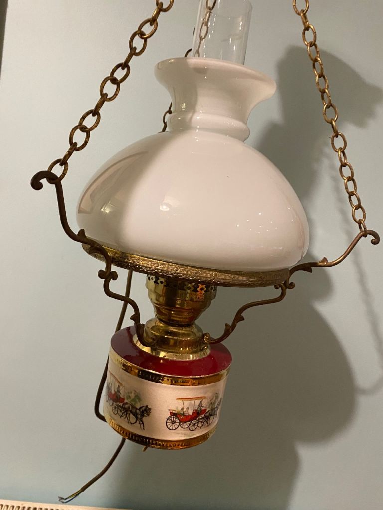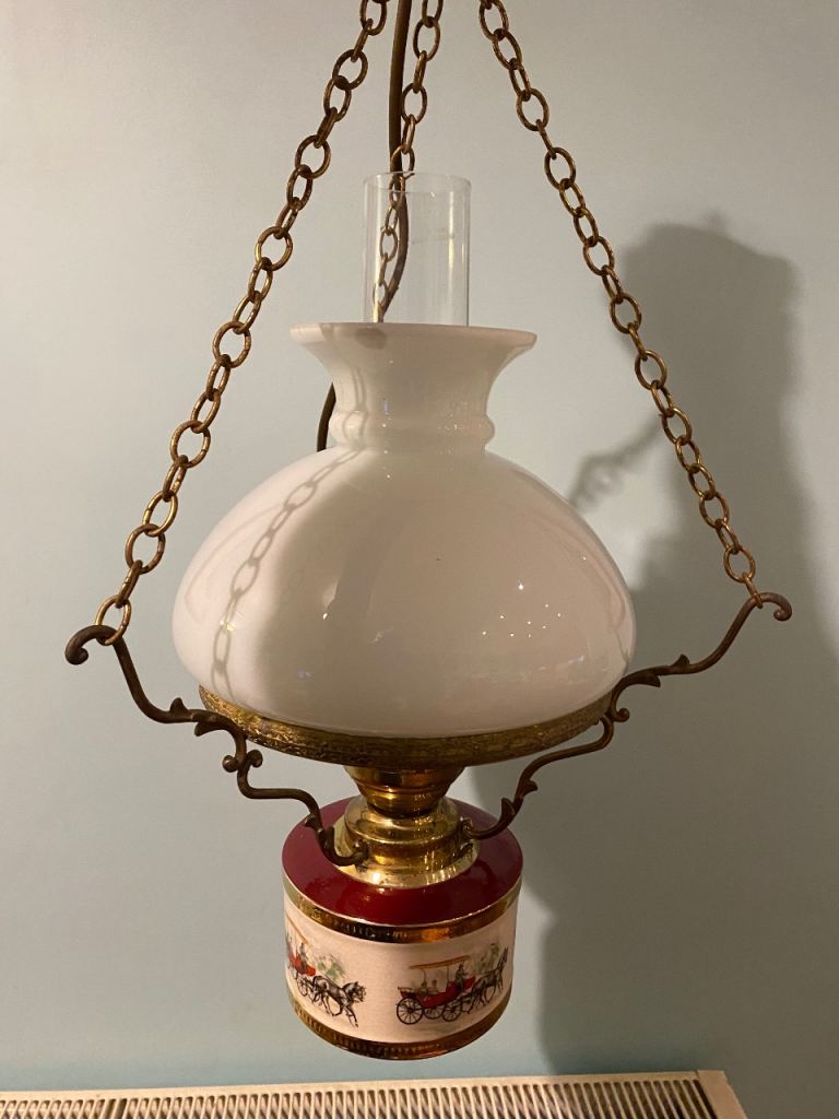 A ceramic and glass vintage lamp pendant. It has a victorian gas/oil lamp style. It features a a metal round ceiling rose and a hook and chain design. The glass is in great condition and the lower lamp has a scene depicting various wagon and horses scenes. It appears to be brass and some parts maybe electro plated. It takes a regular bayonet light bulb fitting and is fully working It's an unusual period light fitting in excellent condition!