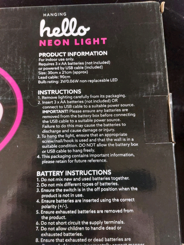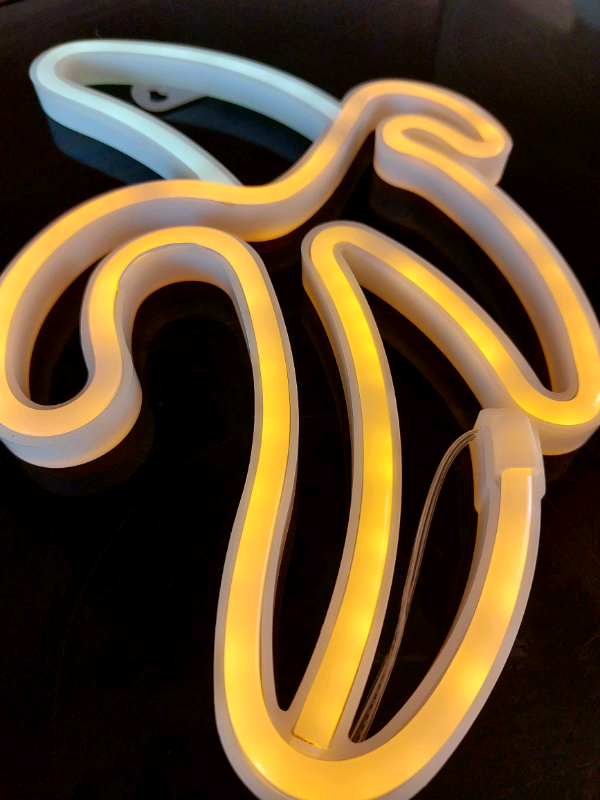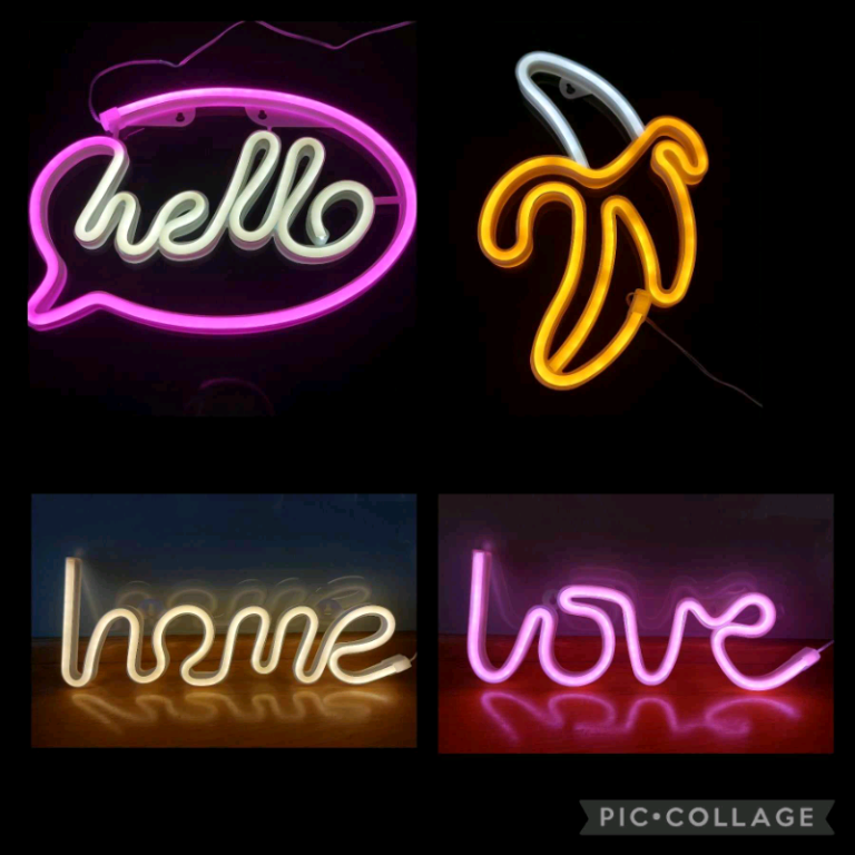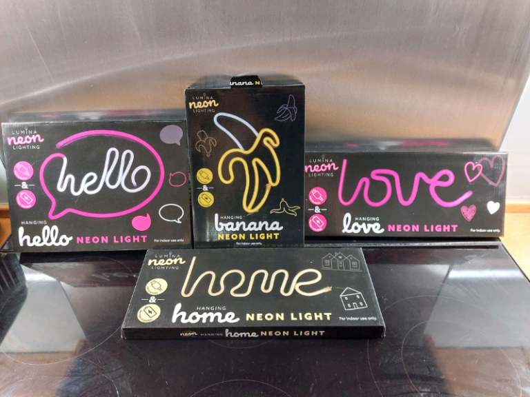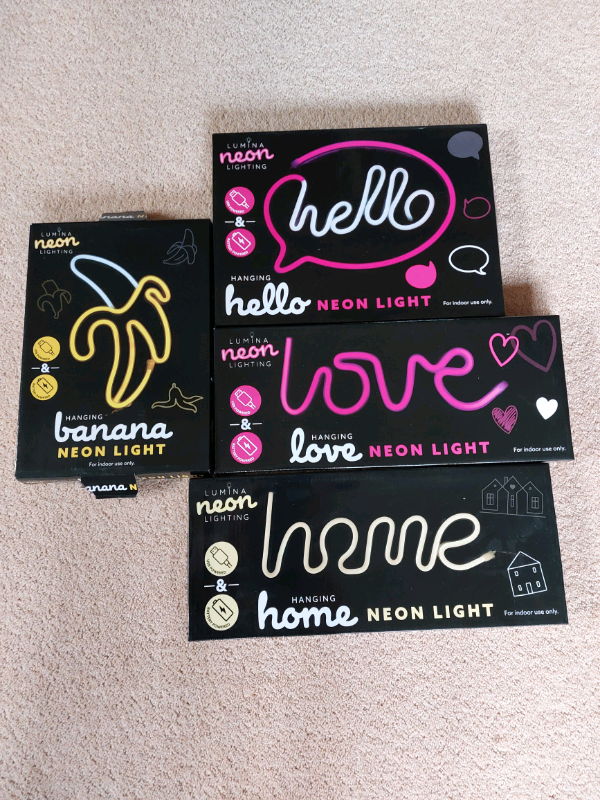 Set of 4 hanging neon lights ideal for fun or bar area outside entertaining area. All brand new in boxes. Lighting is bright and vibrant colours. They are battery operated or can be plugged in via USB.