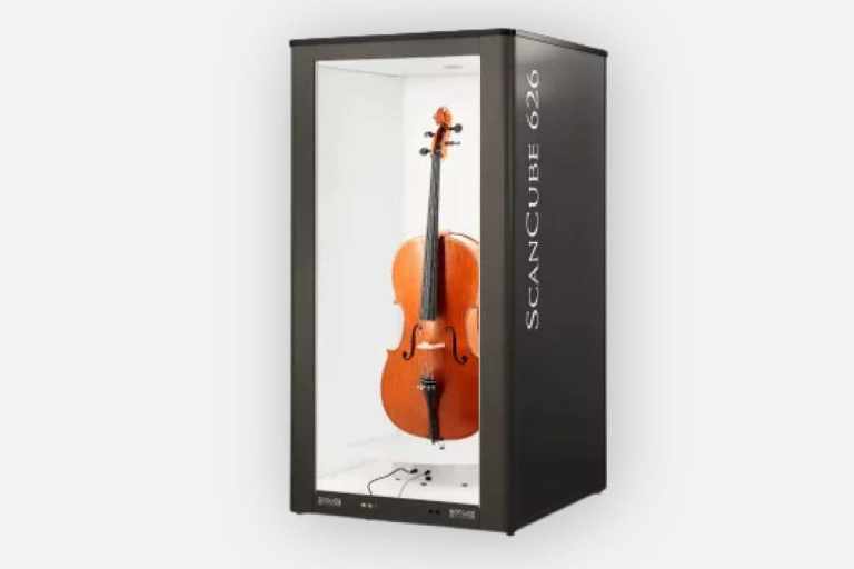 The ScanCube 626 – a fully automated photography studio – allows even large items (like the cello shown) to be captured with consistent professional lighting and backgrounds. This is the largest model in ScanCube’s range, easily handling a variety of products, from small accessories to sizable items (e.g., a pair of shoes to a cello).