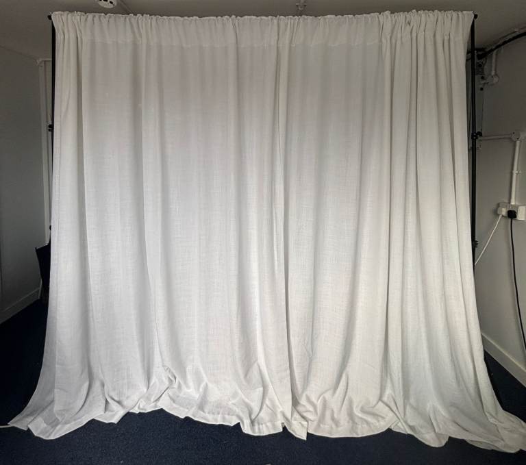 Posting for 1+ monthsBackdrop Stand Kit with White Dunelm Curtains – 10ft × 6.5ft, Excellent Condition