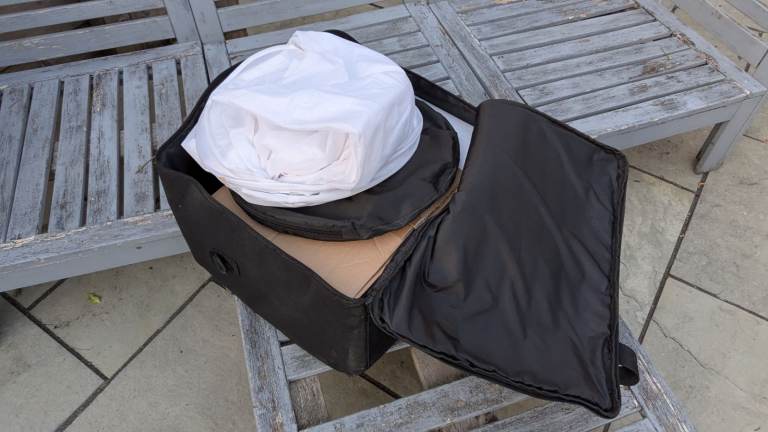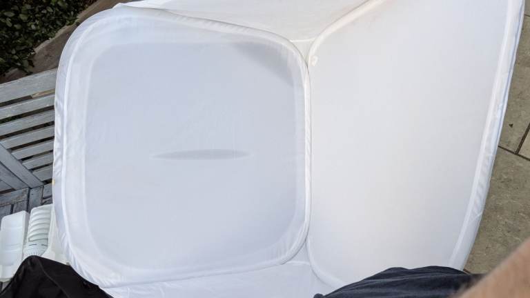 Includes a white soft box (has some markings) and some coloured cloths to decorate the interior.