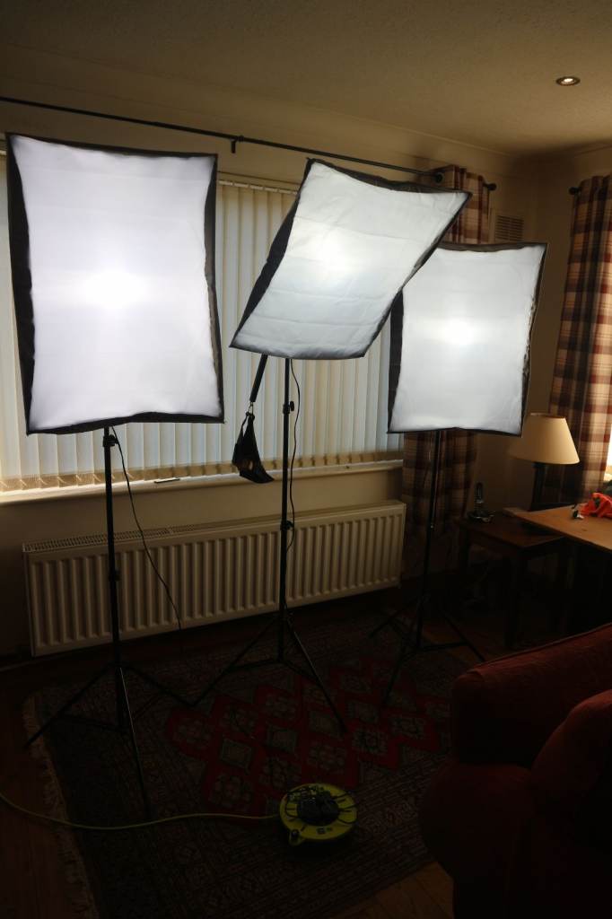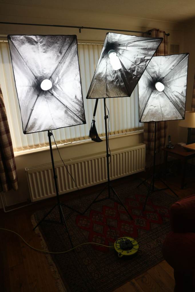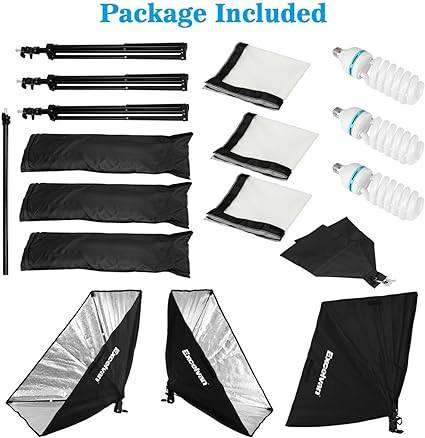 1. 3X 20" X25" Auto Pop Up Soft Boxes, 3X80" adjustable Light Stands, 3X135W 5500K E27 white bulbs.