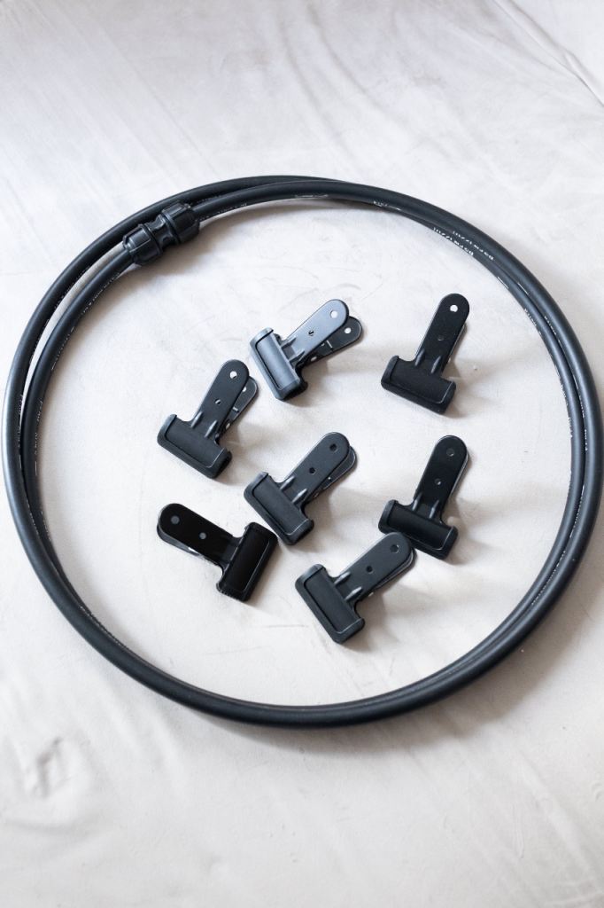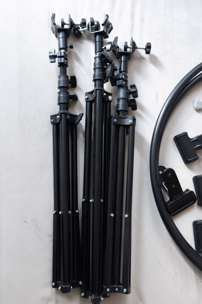 No longer need this set up. I took photos before my husband pointed out that the clips are for our stand backdrop and didn’t come with the shell. So clips not included but the posing pieces, stand and ring is.