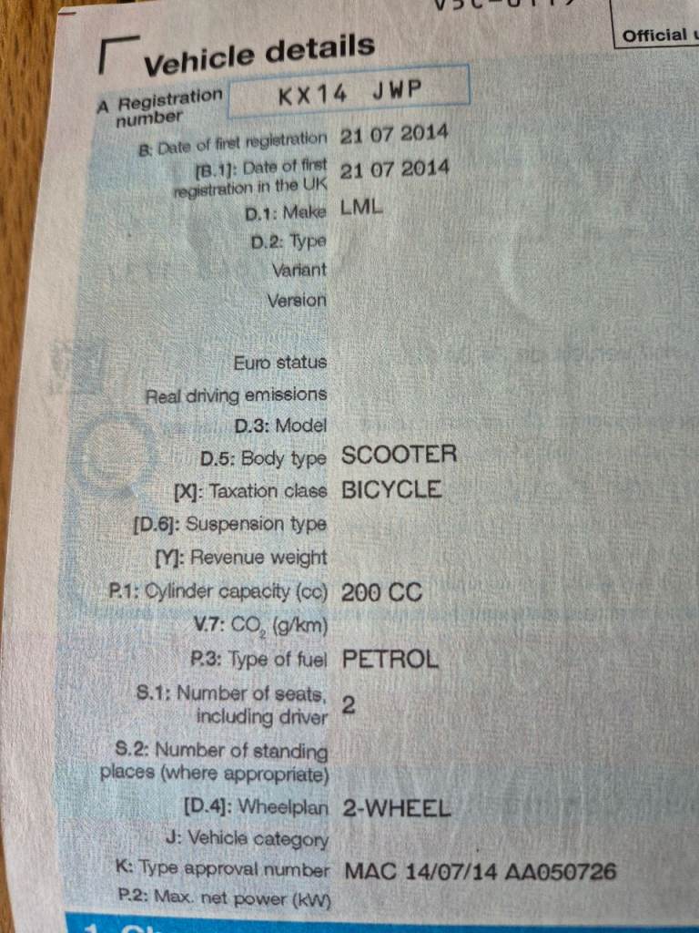 Selling an LML/Vespa 200cc 4 stroke. Very little used, everything works as it should apart from electric start but it kicks starts no problem, 4477 miles old mot's will verify. what you see is what you get, 2 keys which fit the seat and glove box aswell. NO MOT and is sorned grab a bargain. £700 no offers.