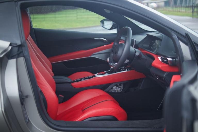 The exterior is enhanced by the Black Pack, privacy glass, 20 inch silver alloy wheels and red brake calipers, giving the car a purposeful yet elegant stance. Inside, the cabin is trimmed in red Nappa leather with Alcantara leather heated electrically adjustable memory seats, complemented by a black leather steering wheel and premium materials throughout.