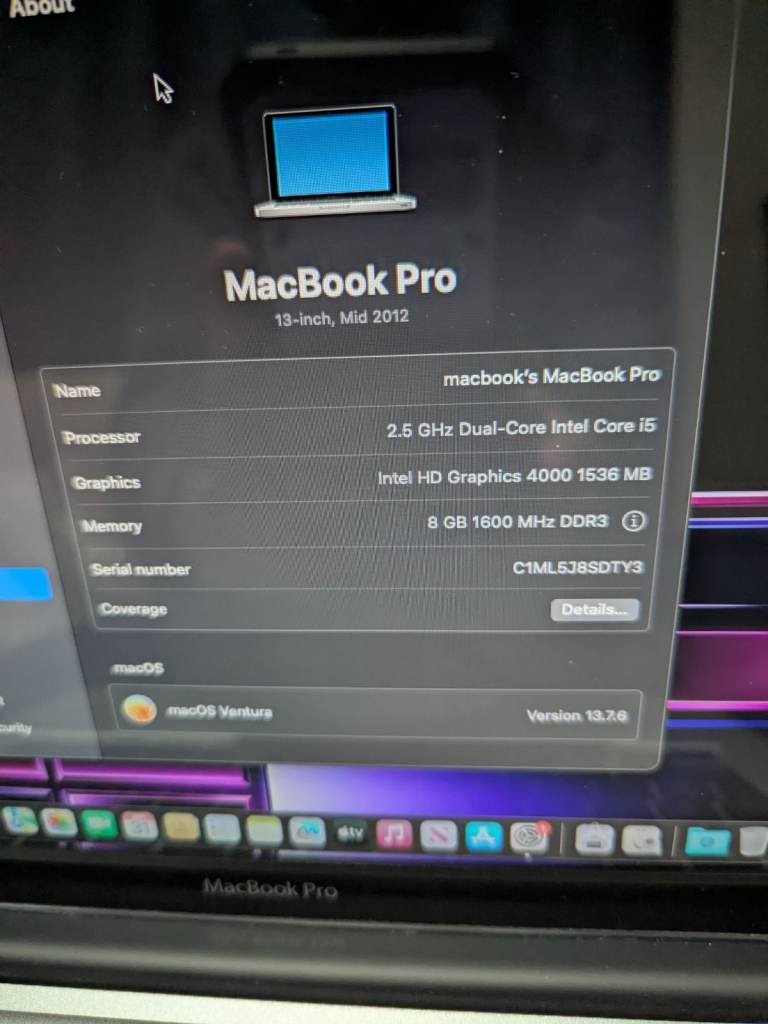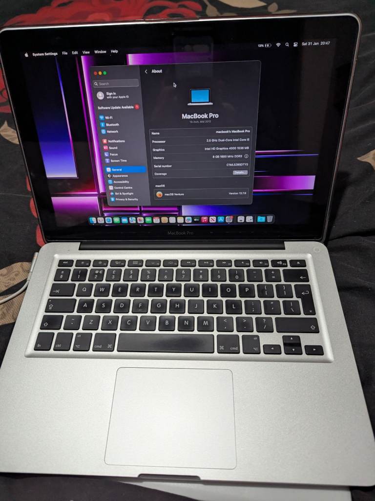 APPLE MACBOOK PRO A1278 13" LAPTOP WITH CHARGER 2.5GHZ I5 CPU, 8GB DDR3 256GB SSD, MACOS VENTURA, INTEL 1536MB GRAPHIC. BATTERY STATUS SAYS NORMAL + SEEMS FINE. MACBOOK HAS MINOR MARKS IN PLACES WITH BRAND NEW 256GB SSD + NEW INSTALL OF MACOS VENTURA 13.7.8 USING OCLP SINCE ITS LAST OFFICIALLY SUPPORTED MACOS WAS CATALINA. BE AWARE THAT BUYING ANY MAC WITH MACOS BIG SUR OR OLDER INSTALLED YOU WILL BE UNABLE TO USE MODERN APPS + THAT IS WHY THIS MAC HAS BEEN UPDATED TO VENTURA. COLLECTION IS CHESTERFIELD OR LOCAL DELIVERY AVAILABLE IF NEEDED. I HAVE OPTIONAL BRAND NEW PLASTIC CASING THAT COVERS LID, BOTTOM + SIDES IF REQUIRED FOR £12.