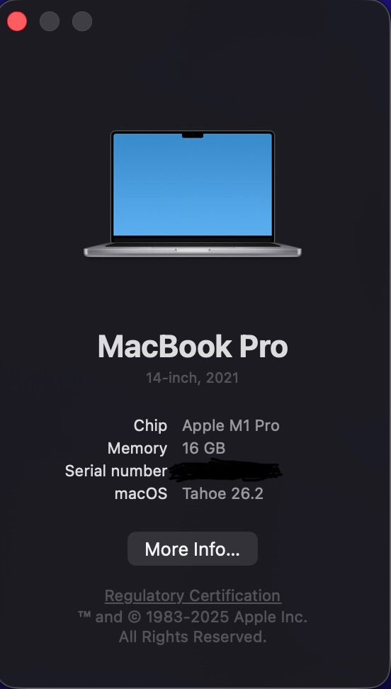 The latest MacOS Tahoe 26.2 is installed, and prior to viewing this MacBook Pro will be erased and factory reset.