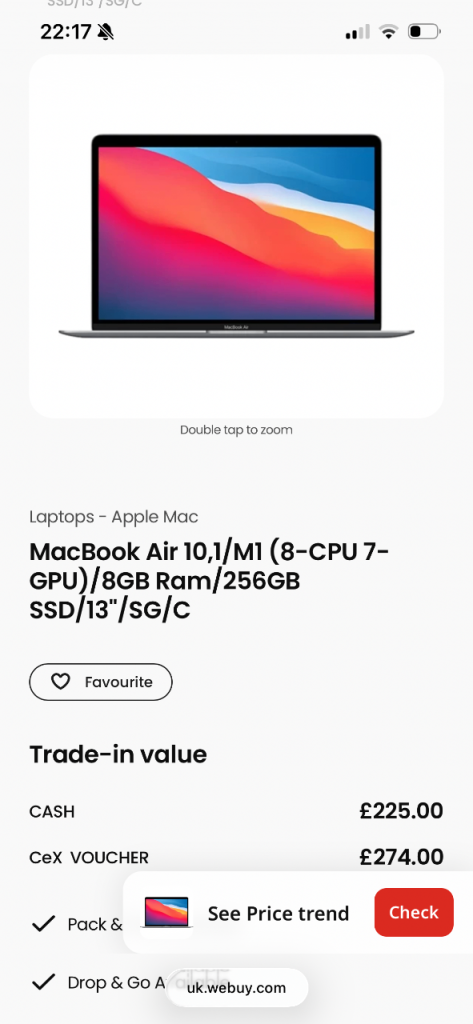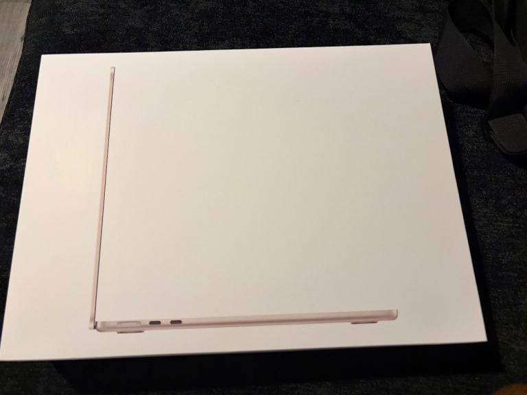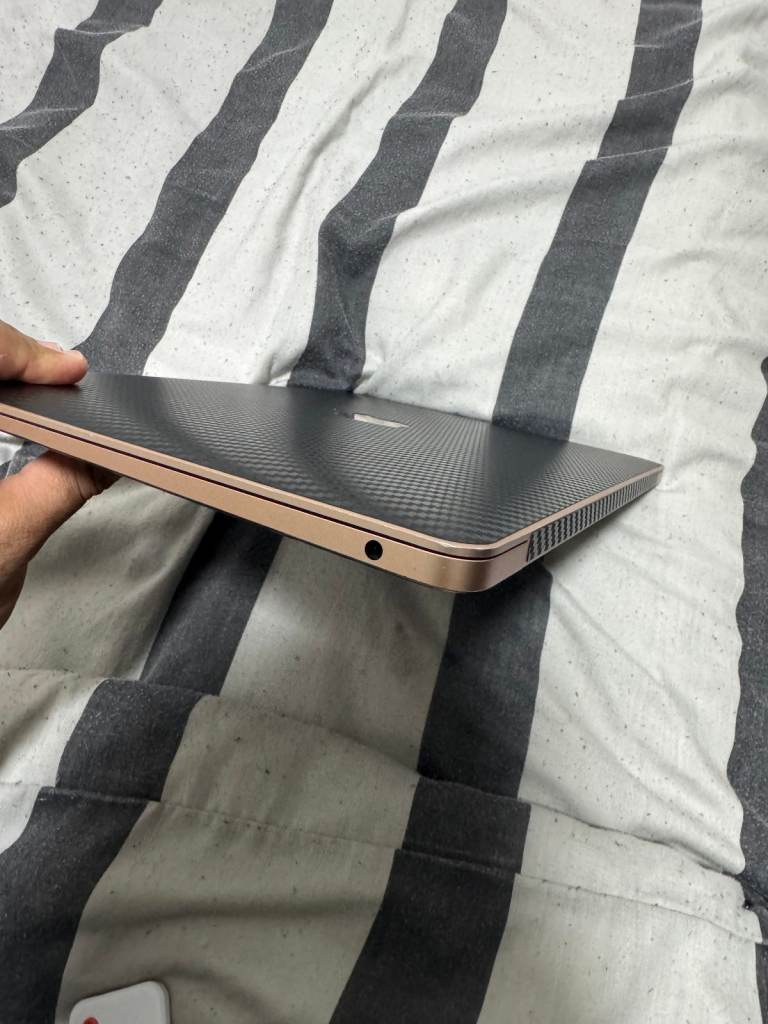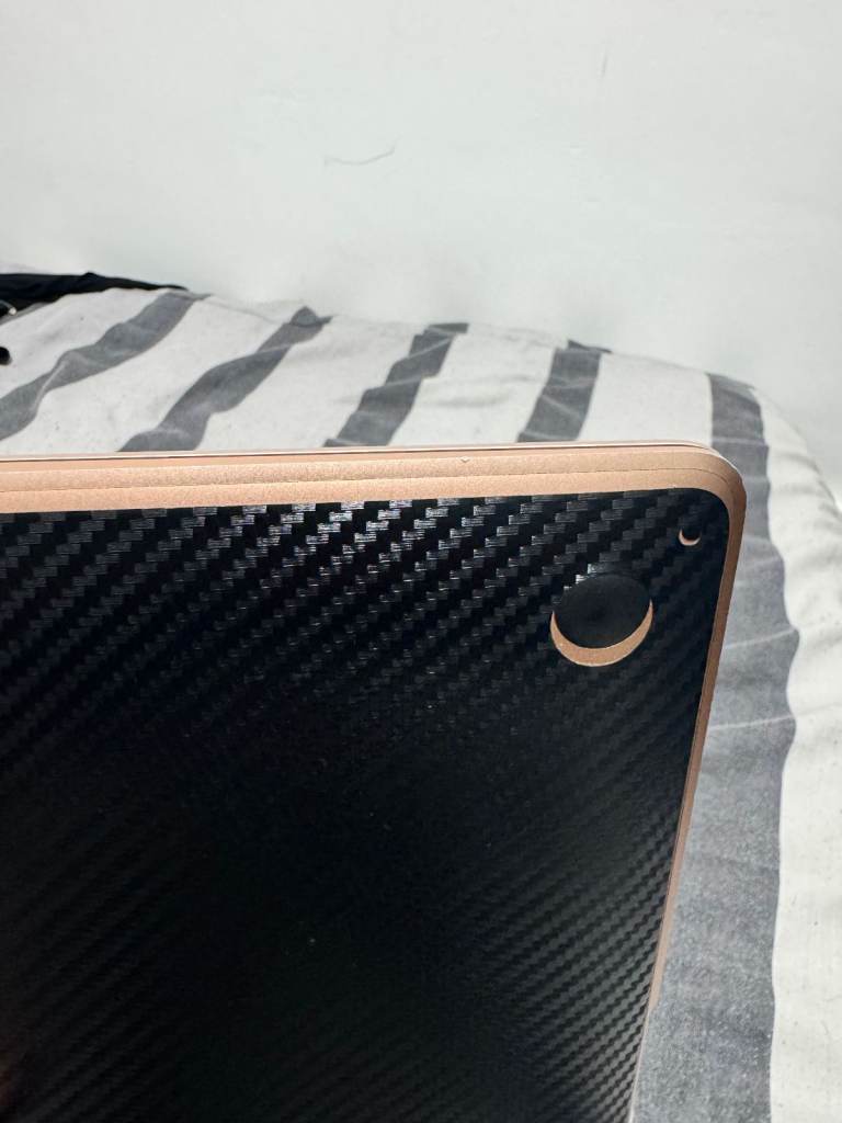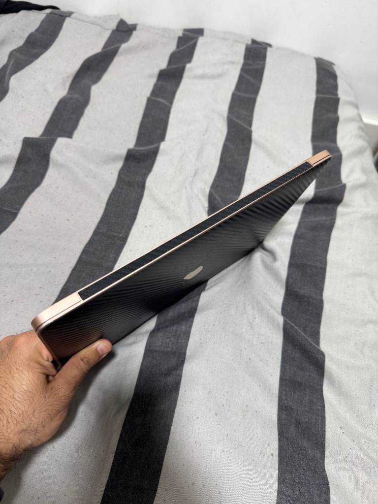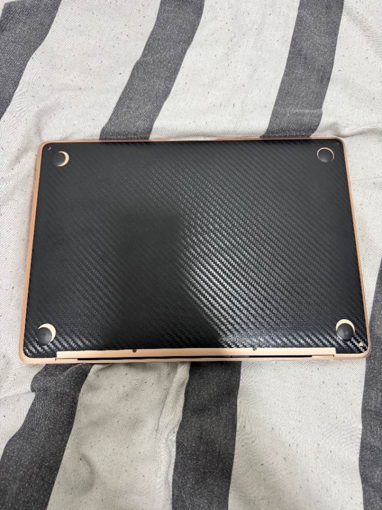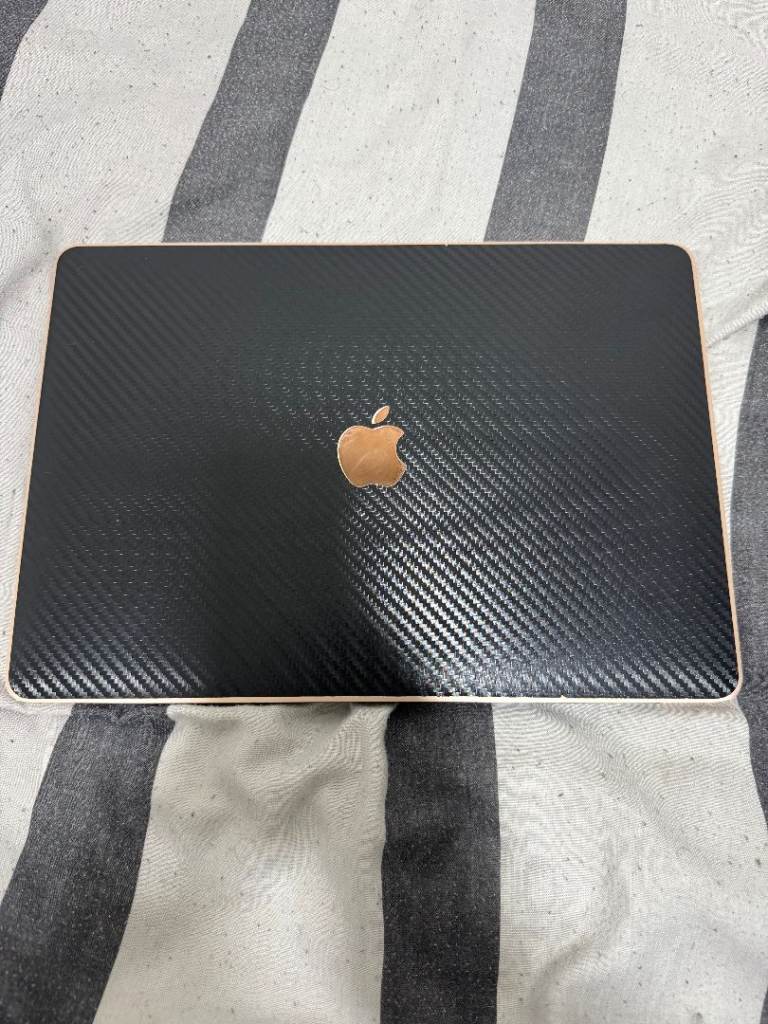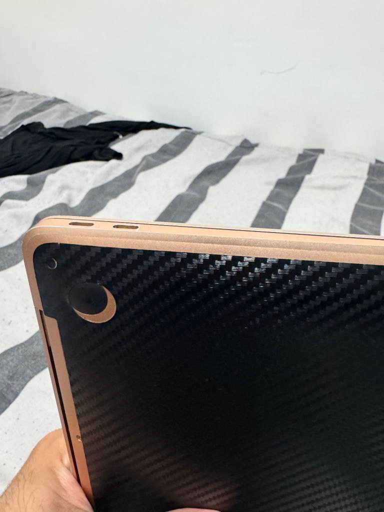 Hey, I'm selling my personal Macbook Air M1, 8GB RAM, 256 GB SSD, in rose gold colour with a black carbon skin attached.