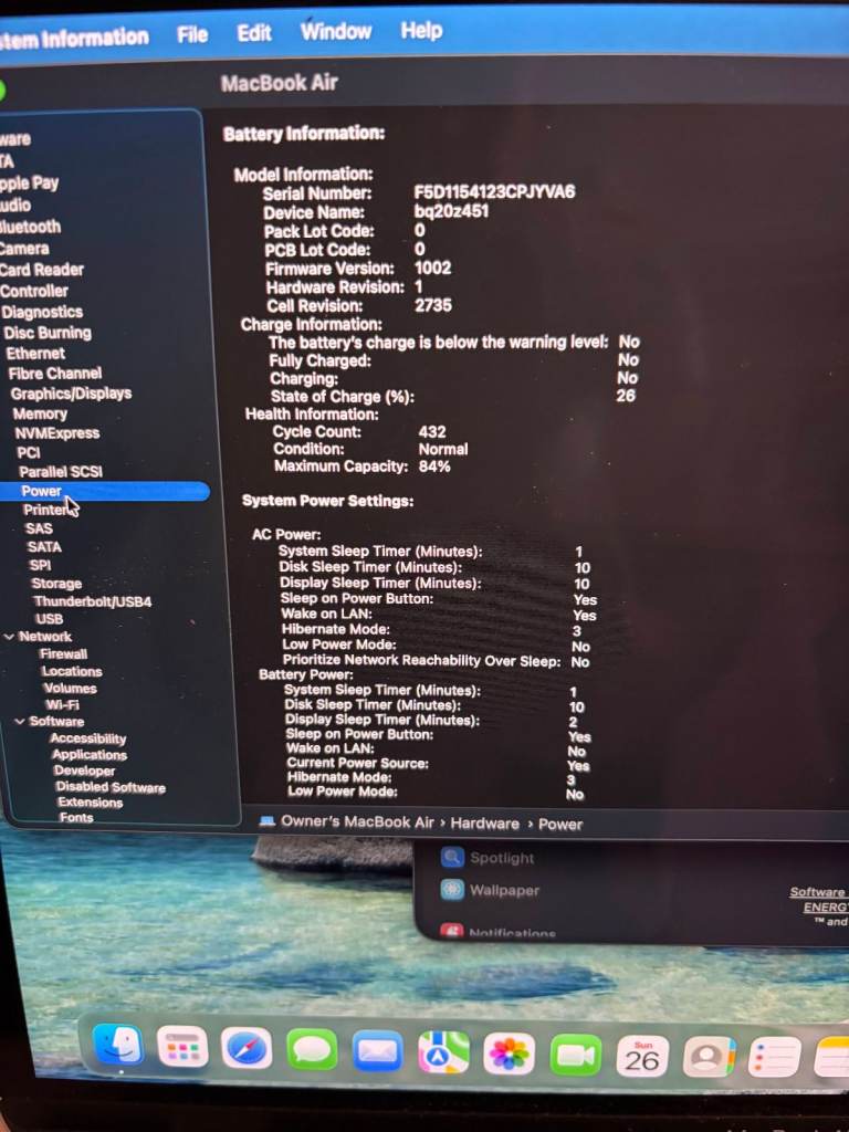 The Mac is in perfect working condition, but there are a few cosmetic blemishes that can be seen in the pics. Machine has been wiped and updated to macOS Tahoe. Battery health 84%, cycle count 432. There is no charger included with this machine.