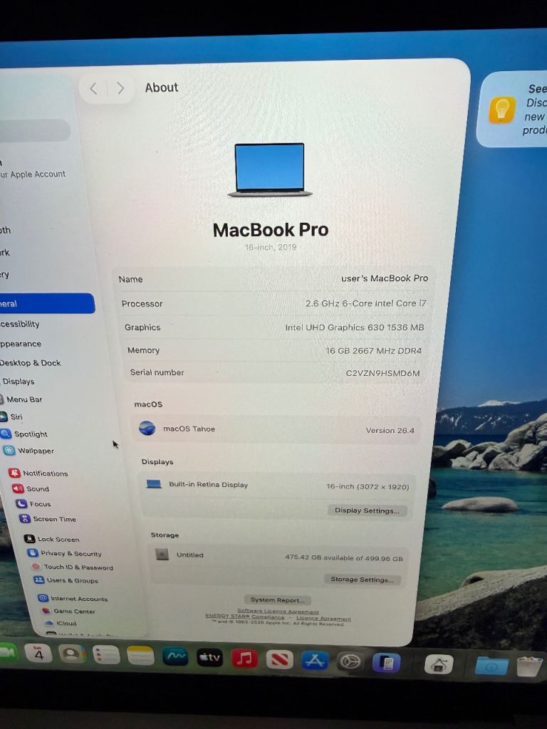MacBook Pro 2019 16-inch 6-core i7 16GB ram 500GB SSD Touch Bar Touch ID