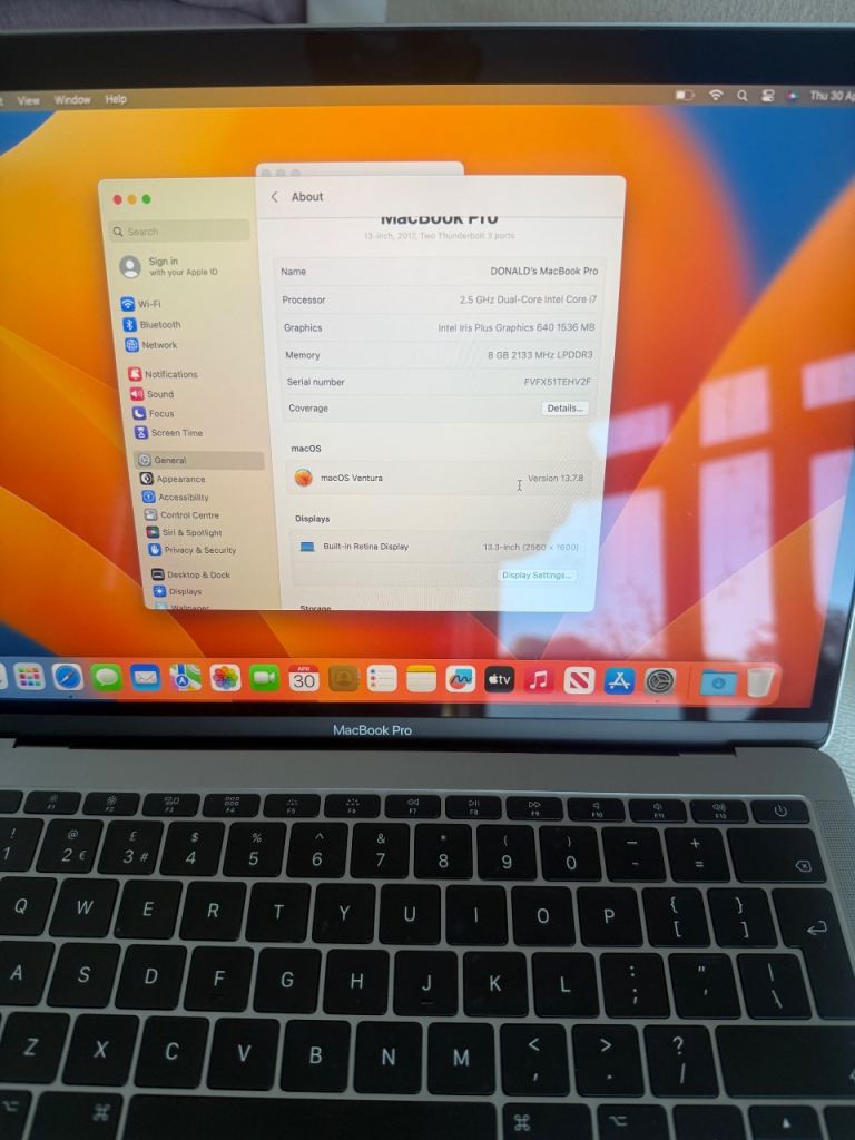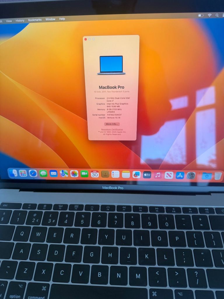 Hi here I have for sale MacBook Pro 13 “ late 2017 i7 fully wiped and ready for the new owner condition is good no scratches or dents just the age related marks any questions feel free to contact. Thanks for looking