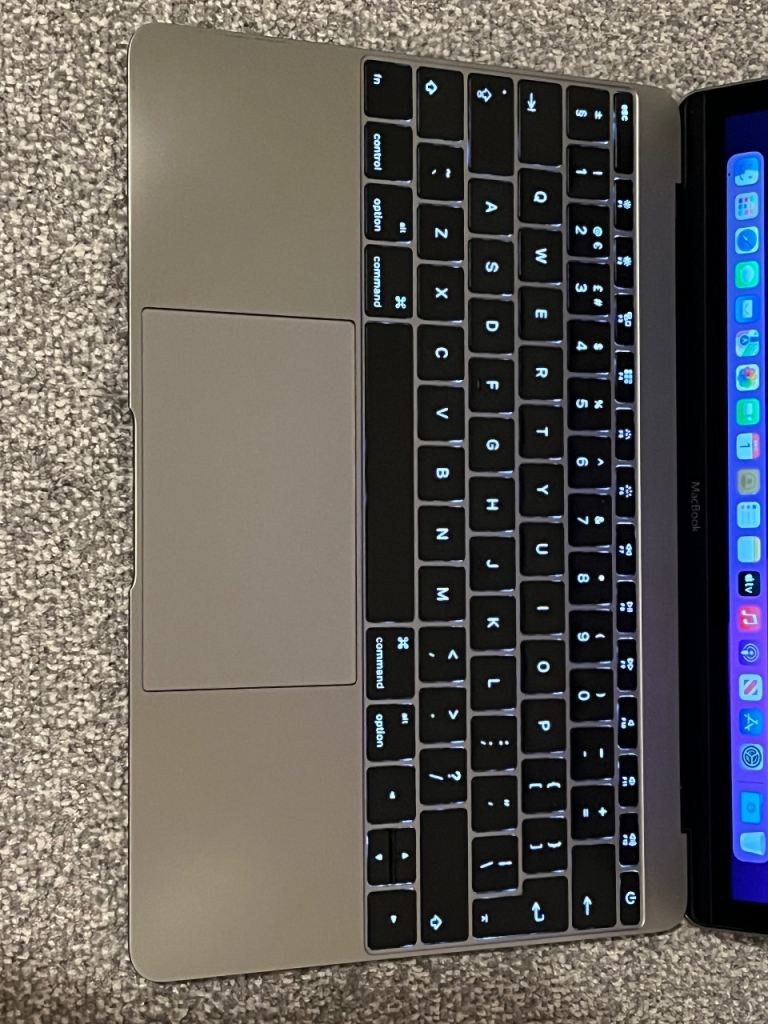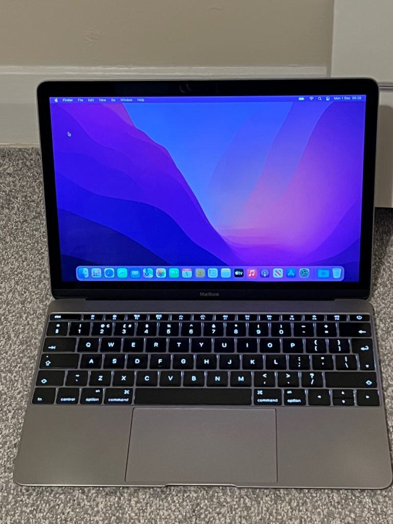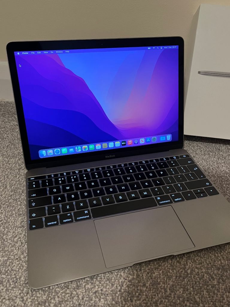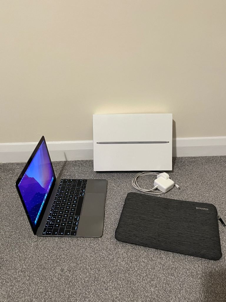 MacBook (Retina, 12-inch) in Space Gray. Purchased on October 12, 2016. Excellent condition with very slight wear on black seal where the camera is, as this is where the MacBook opens and all in working order. No longer needed. Original box and power charger with a laptop case, incase brand.