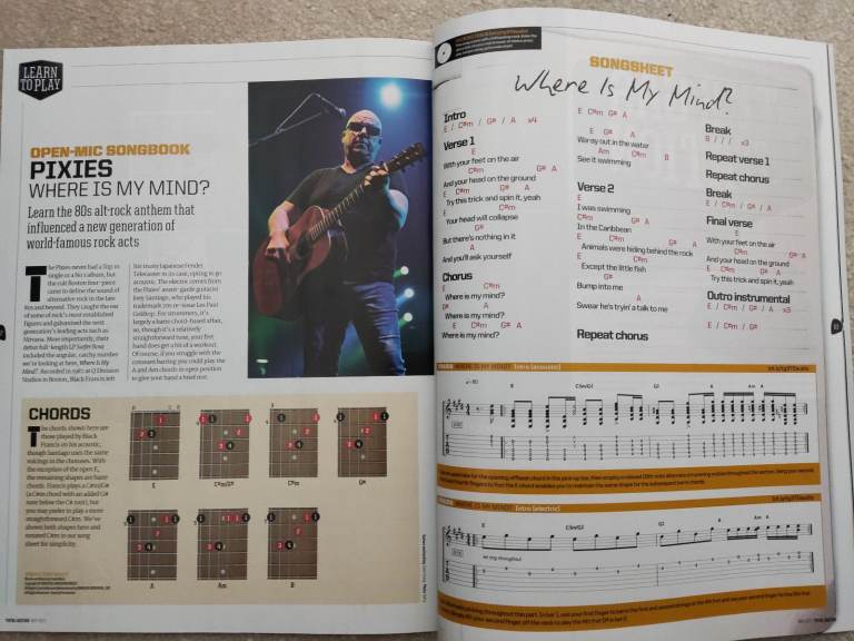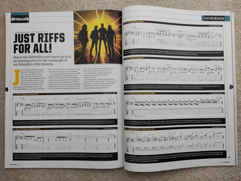 Each issue has interviews with guitarists, equipment reviews, news. Each issue also includes songs to learn, plus lessons on specific topics.