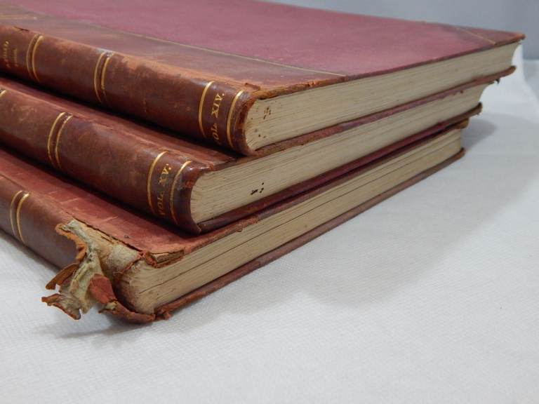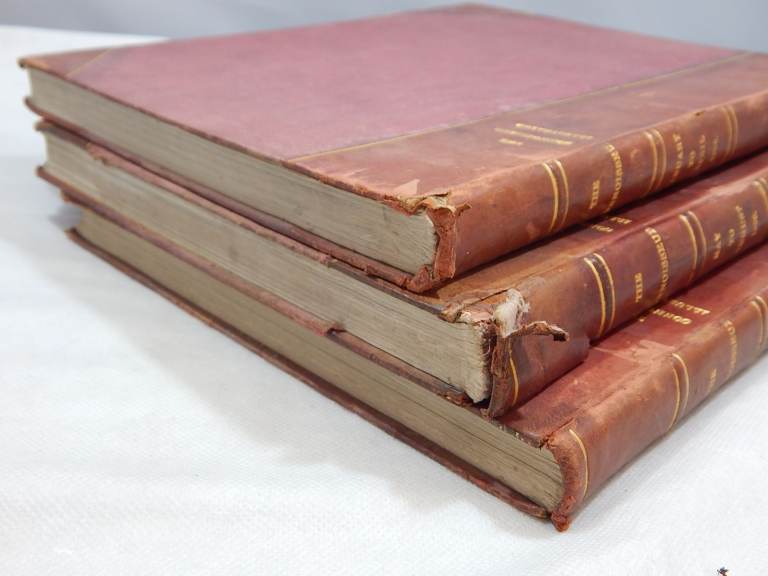 The covers present signs of wear due to age and storage as you can see in the photos, pages a bit yellowed as expected, but all three volumes are firmly bounded.