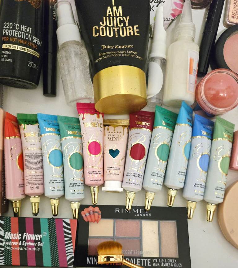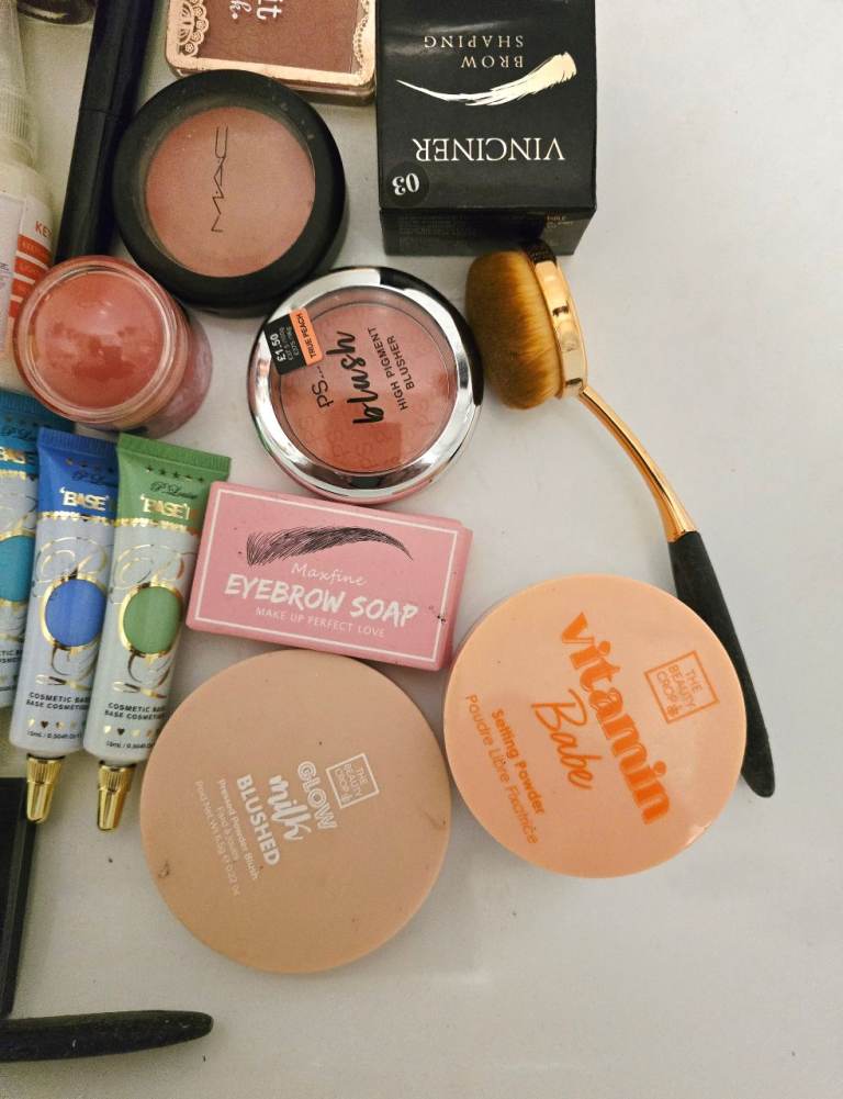 Face & Brows: "Vitamin Babe" Bronzer/Powder, Ustar Blusher Kit, Music Flower Brow Gel, Maxfine Brow Soap, Miss Young Mint Palette, PS Blush, and various lip/cheek pots.