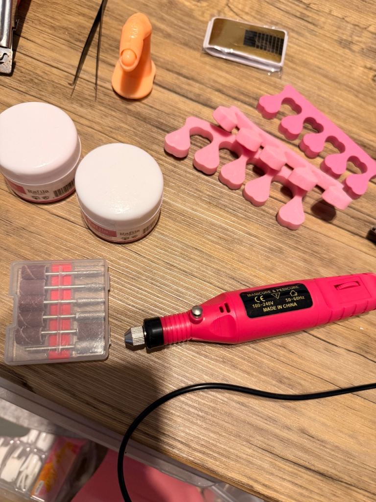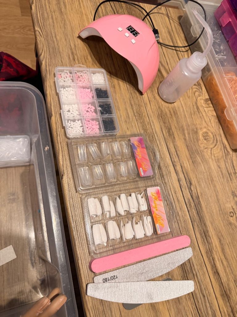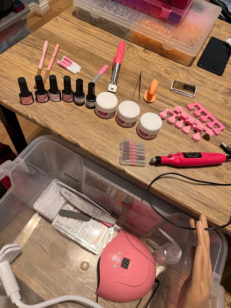 Included is mini uv lamp, fake nails (both for the practice hand and for real nails), nail buffer, some nail art, powder and some mini gel polish.