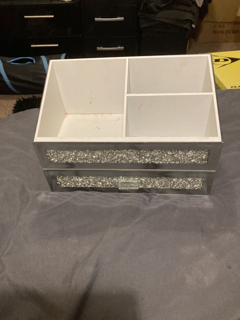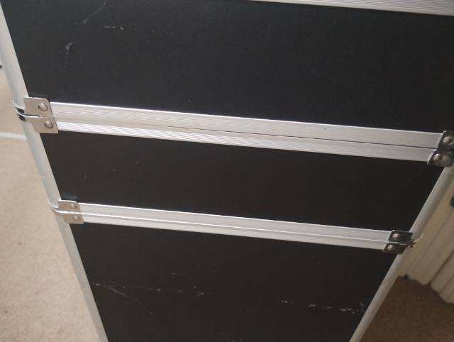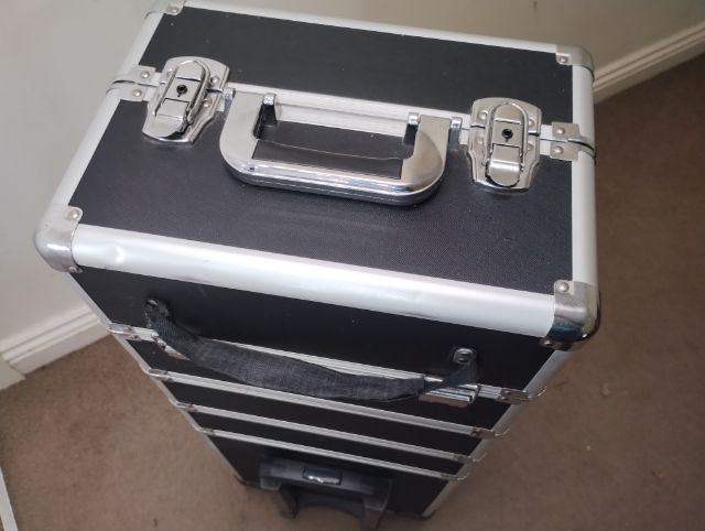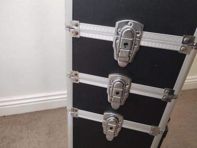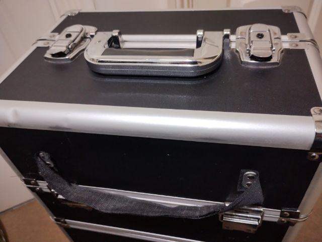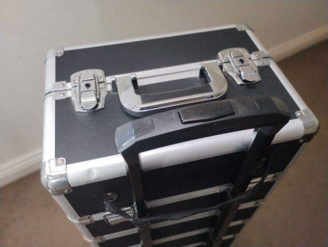 Four-level make-up trolley protects your make up while you're on the go. . Chrome hinges and a black carry handle. Used condition and priced accordingly. Functionally good but cosmetically imperferct.
