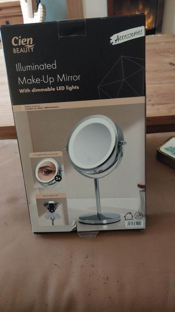 girls/lady makeup mirror, lights up ,runs on 4 aaa batteries included unwanted present brand new in box never opened