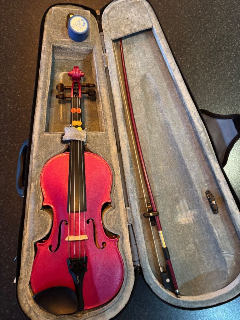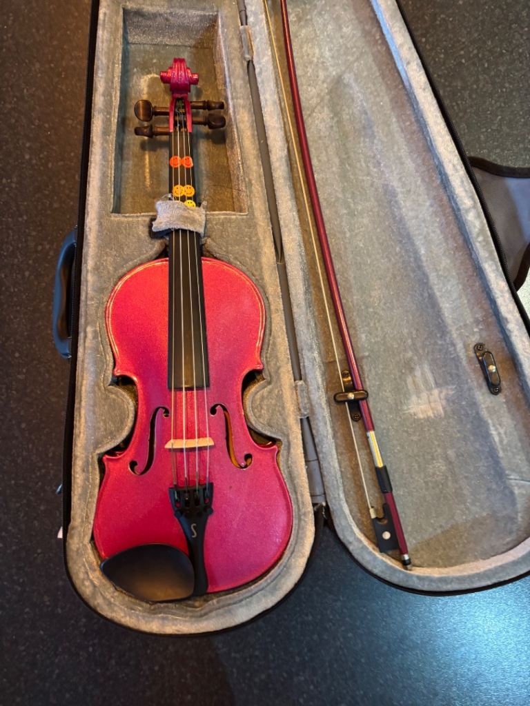 Used pink Stentor Harlequin 1/2 Violin in pink, currently has Viola strings but can be easily changed. Very good condition only one small mark as shown in the pictures.