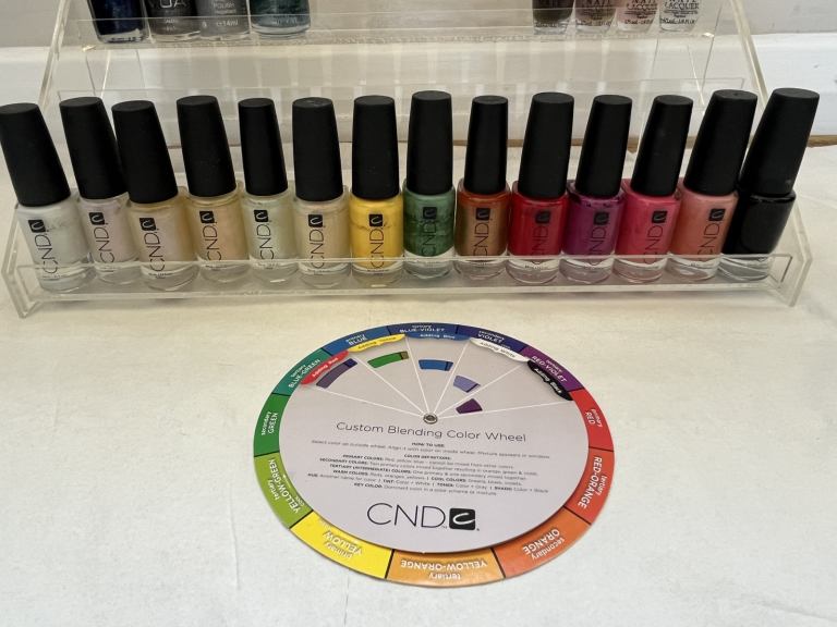 14 bottles of CND nail polish with CND custom blending colour wheel.