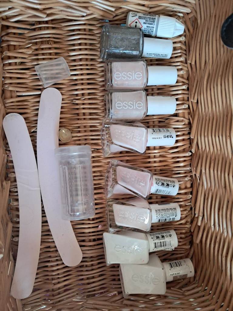 Pinks and glitter Essie nail polish. Mostly full. As seen with the other bits in the hamper too. £2 each.