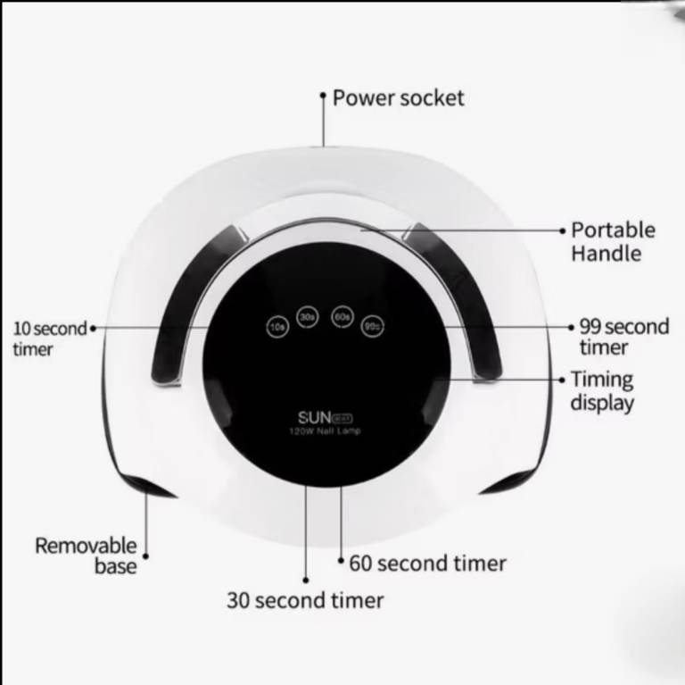 The product is a UV LED Nail Lamp with 4 timer settings and a nail dryer with automatic sensor, designed for use in manicure and pedicure treatments. The nail dryer is electric-powered and made of plastic, featuring a stylish metallic pink colour. It includes a charge cable in the set, making it convenient and easy to use for professional or at-home nail care. Its automatic sensor ensures efficient drying and curing of nails, while the timer settings allow for customizable drying times to achieve the desired results.