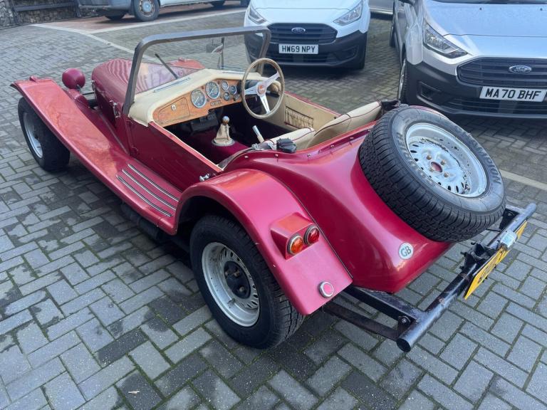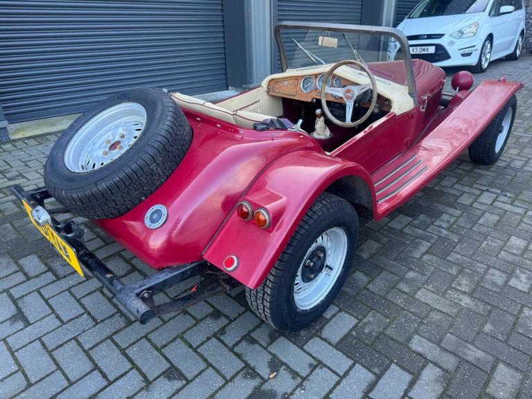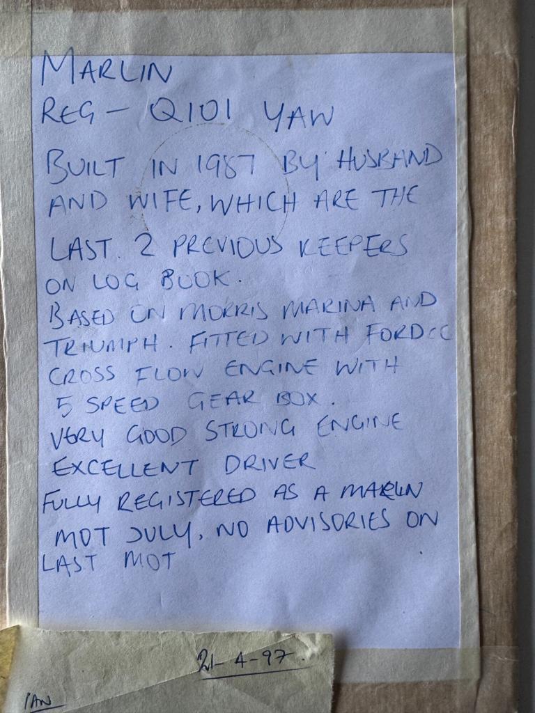 Built in 1987 this Marlin Roadster is in great overall condition. It starts on the button and drives well. Brakes are good and there is no corrosion to the chassis.Fitted with the sought after Kent 1.6 crossflow Engine, 5 speed Sierra box and Ford standard rear axle.Depending on what you'd like to achieve with it, there is very little to do to. The rear lights and indicators need wiring and the headlights have seen better days. cosmetically good but needs some tlc. The car has no mot.The soft top frame is present as is the hood which is in poor condition but ideal for using as the pattern for a replacement.There are additional images on our website showing invoices for all the engine parts used when the engine had a complete overhaul..