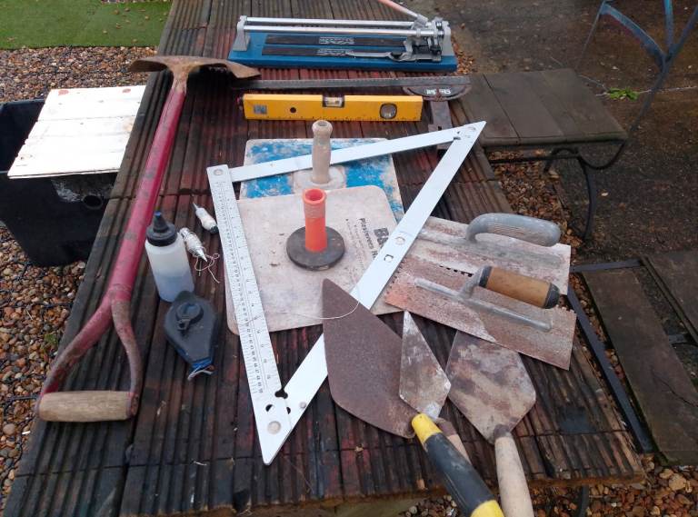 bricklaying trowels (3) plastering trowel, notched trowel, hawks(2) folding square 500mm , adjustable angle square 600mm, 400mm tile cutter, 400mm level, plumb bobs (2), chalk line + chalk, heavy steel shaft shovel.